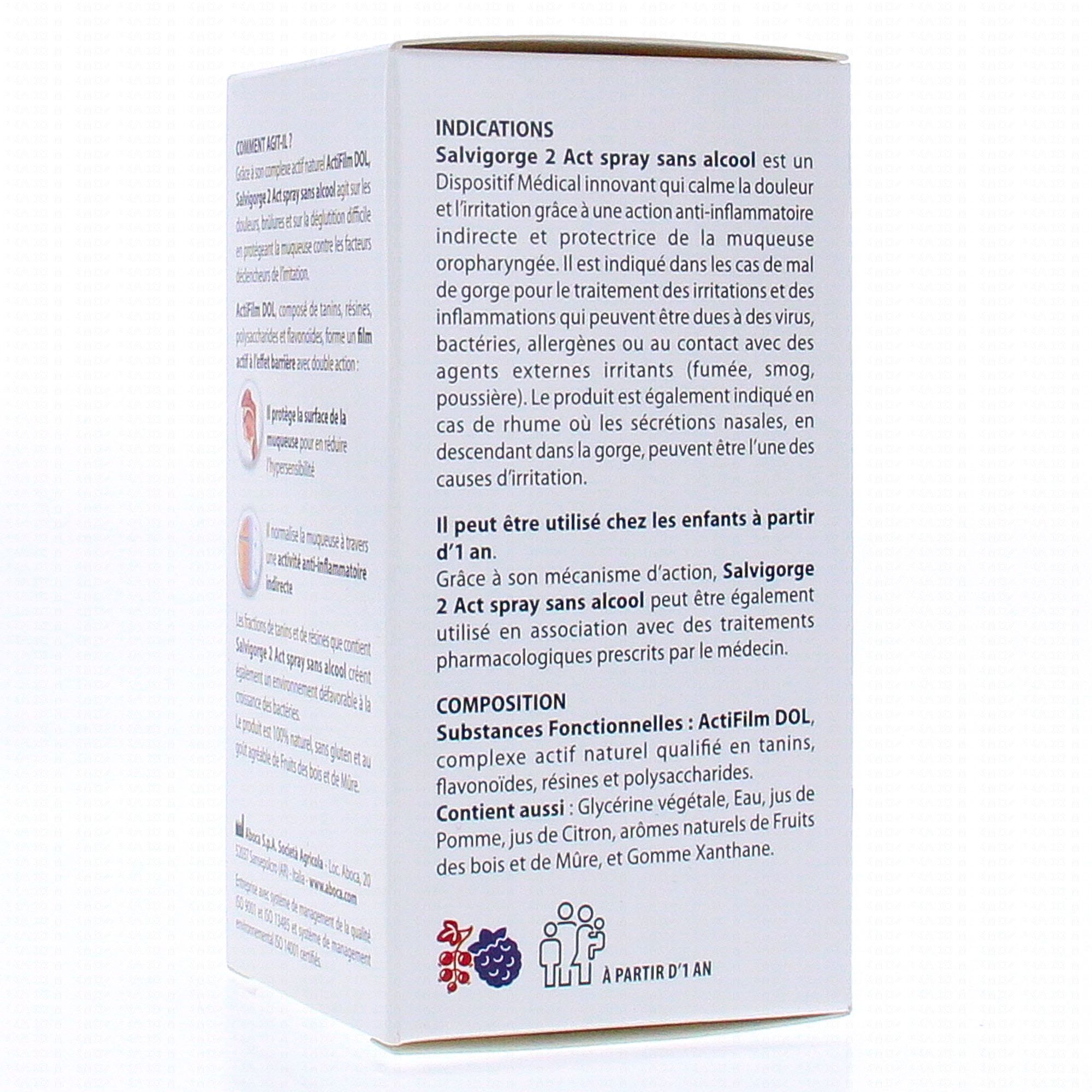 Salvigorge 2 Act spray sans alcool est sans gluten et au goût agréable de Fruits des bois et de Mûre.