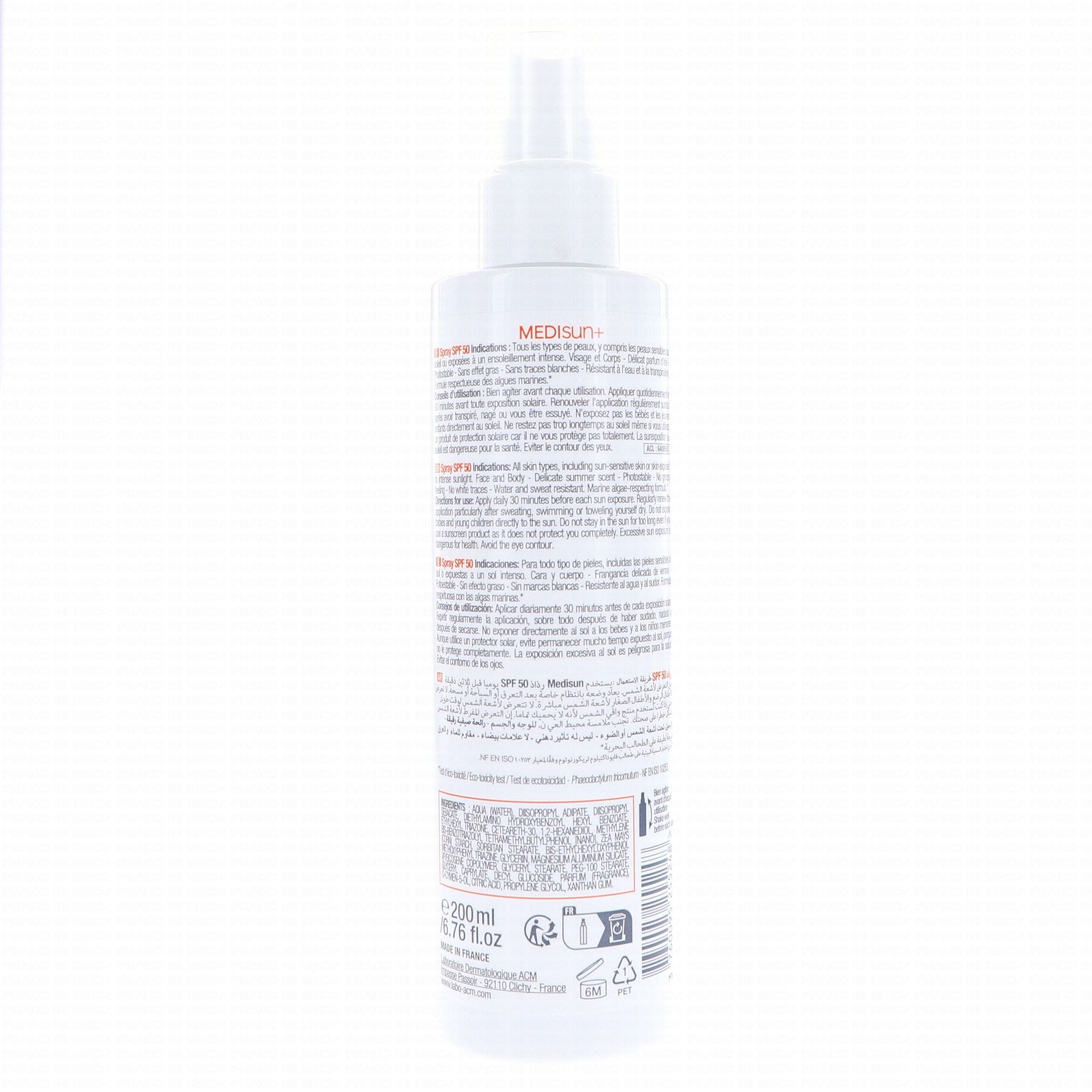 Le Spray SPF50 MEDISUN+ offre une haute protection solaire (UVB, UVA, lumière visible et infrarouge) grâce à une combinaison de filtres solaires photostables, spécialement formulée pour tous les types de peaux, y compris les peaux sensibles.
