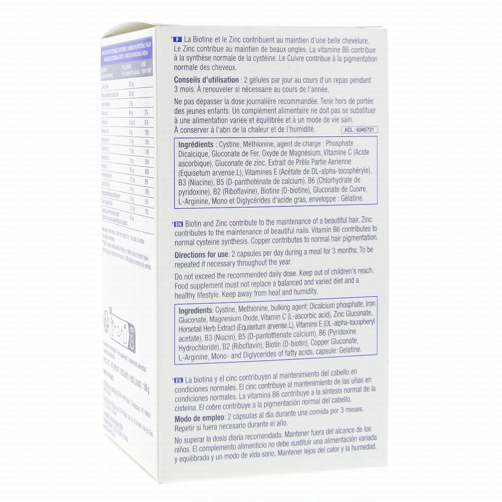 En stockCystine, Méthionine, Agent de charge : Phopshate dicalcique, Gluconate de fer, Oxyde de magnésium, Vitamine C (Acide ascorbique), Gluconate de zinc, Extrait de prêle partie aérienne (Equiseum arvense L.), Vitamines E (Acétate de DL-alpha-tocophéryle), B3 (Niacine), B5 (D-panthoténate de calcium), B6 (Chlorhydrate de pyridoxine), B2 (Riboflavine), Biotine (D-Biotine), Gluconate de cuivre, L-arginine, Mono et Diglycérides d'acides gras, Enveloppe : Gélatine.