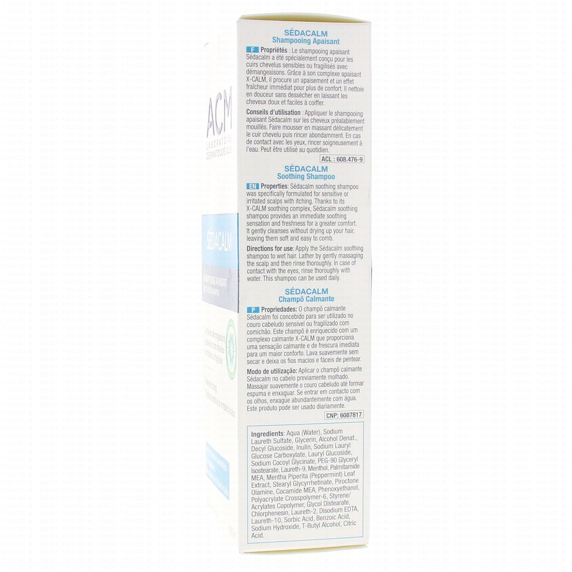 Frais et léger, le shampooing apaisant Sédacalm procure un apaisement et un effet fraîcheur immédiat agréable pour plus de confort. Il prévient les démangeaisons et les calme dès la 1ère utilisation. Son association de bases lavantes ultra-douces permet un nettoyage en douceur sans dessécher le cuir chevelu.