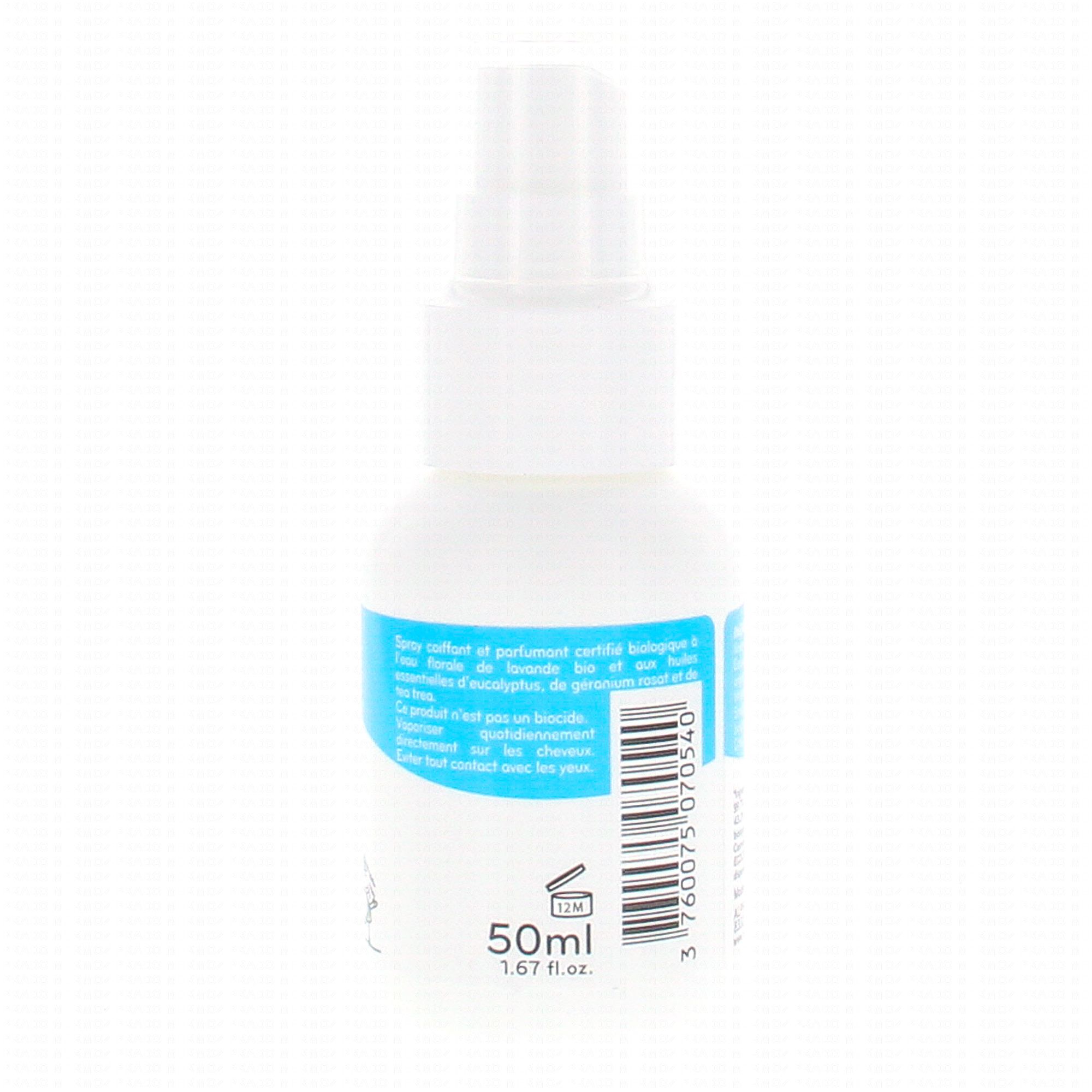 Sans insecticide, à base d'eau florale de lavande bio, enrichie en huiles essentielles d'eucalyptus et lavande et géranium, sa formule prévient l'apparition des poux sur les cheveux des enfants.