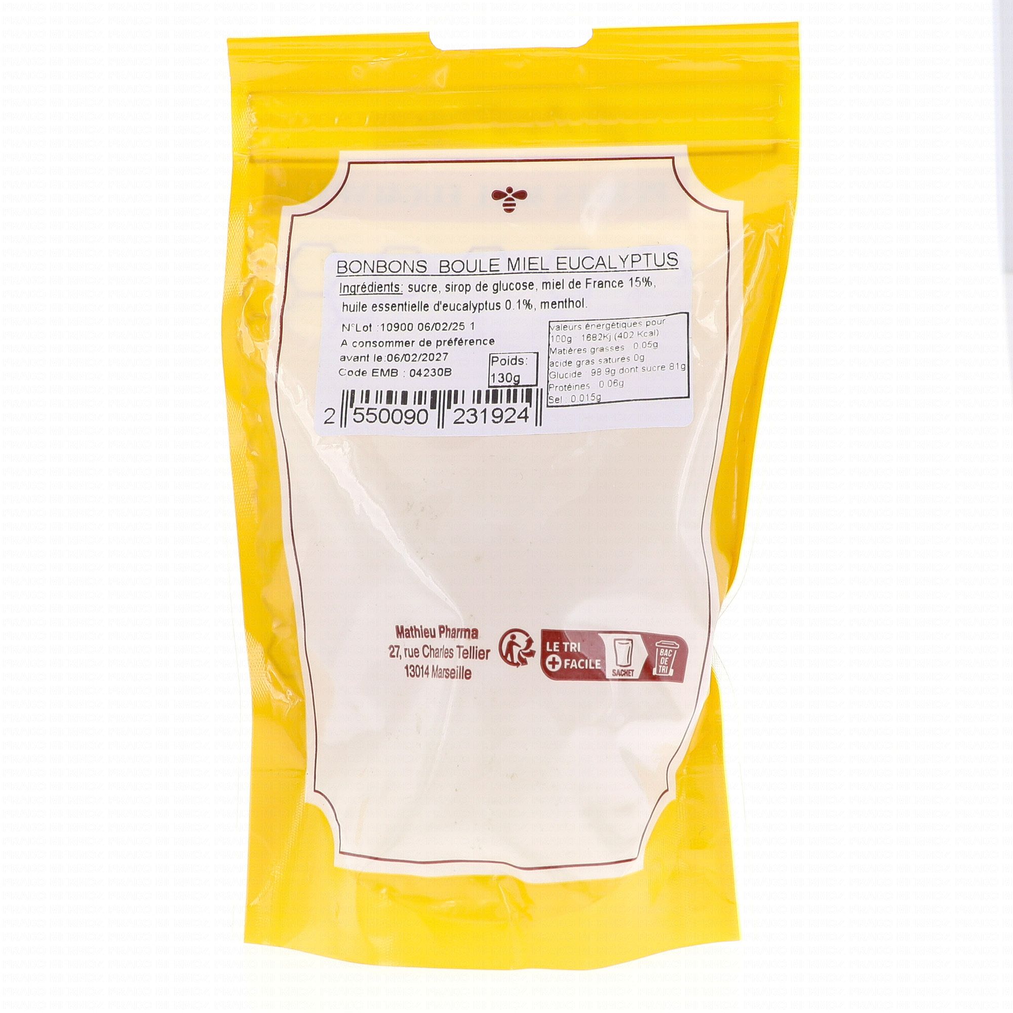 Sucre, sirop de glucose, miel de France 15%, huile essentielle d'eucalyptus 0,1%, menthol.