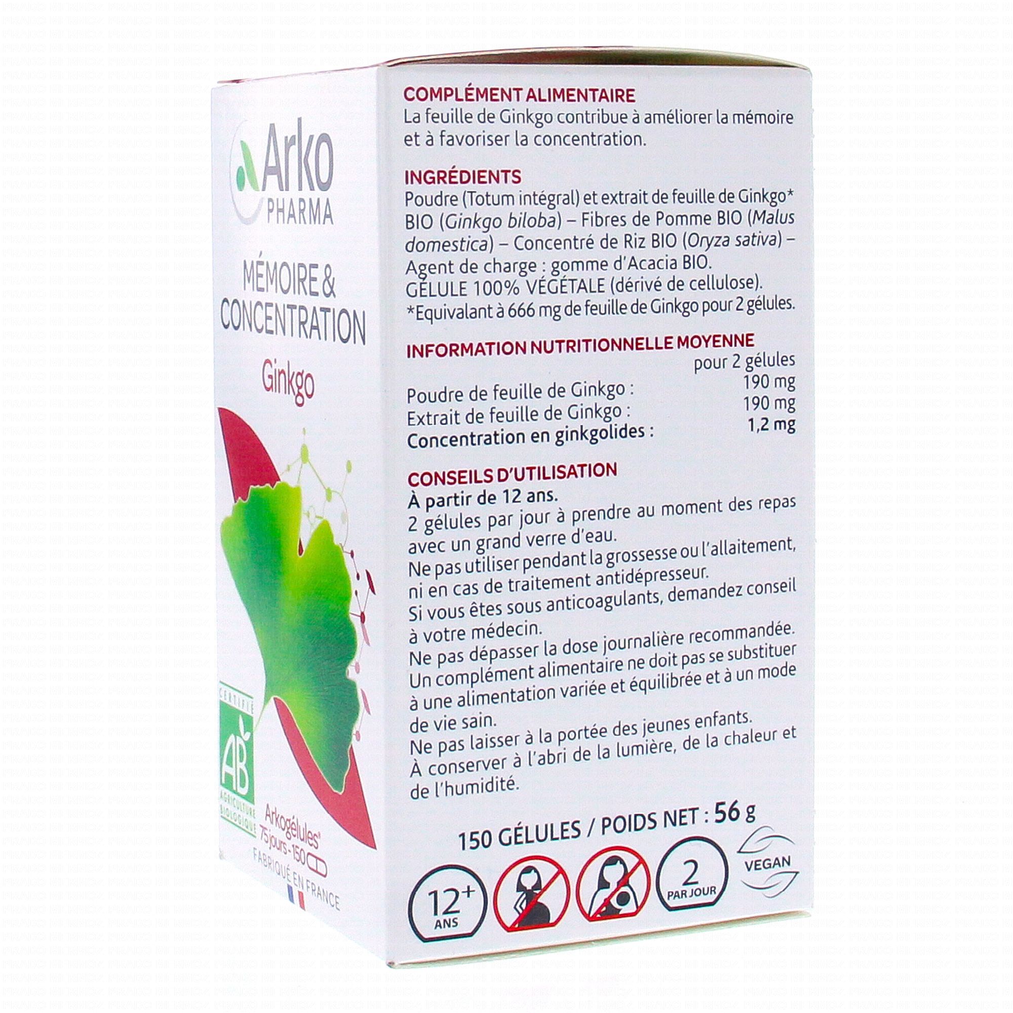 ARKOPHARMA Arkogélules Ginkgo Bio mémoire et concentration contient les éléments suivants :
