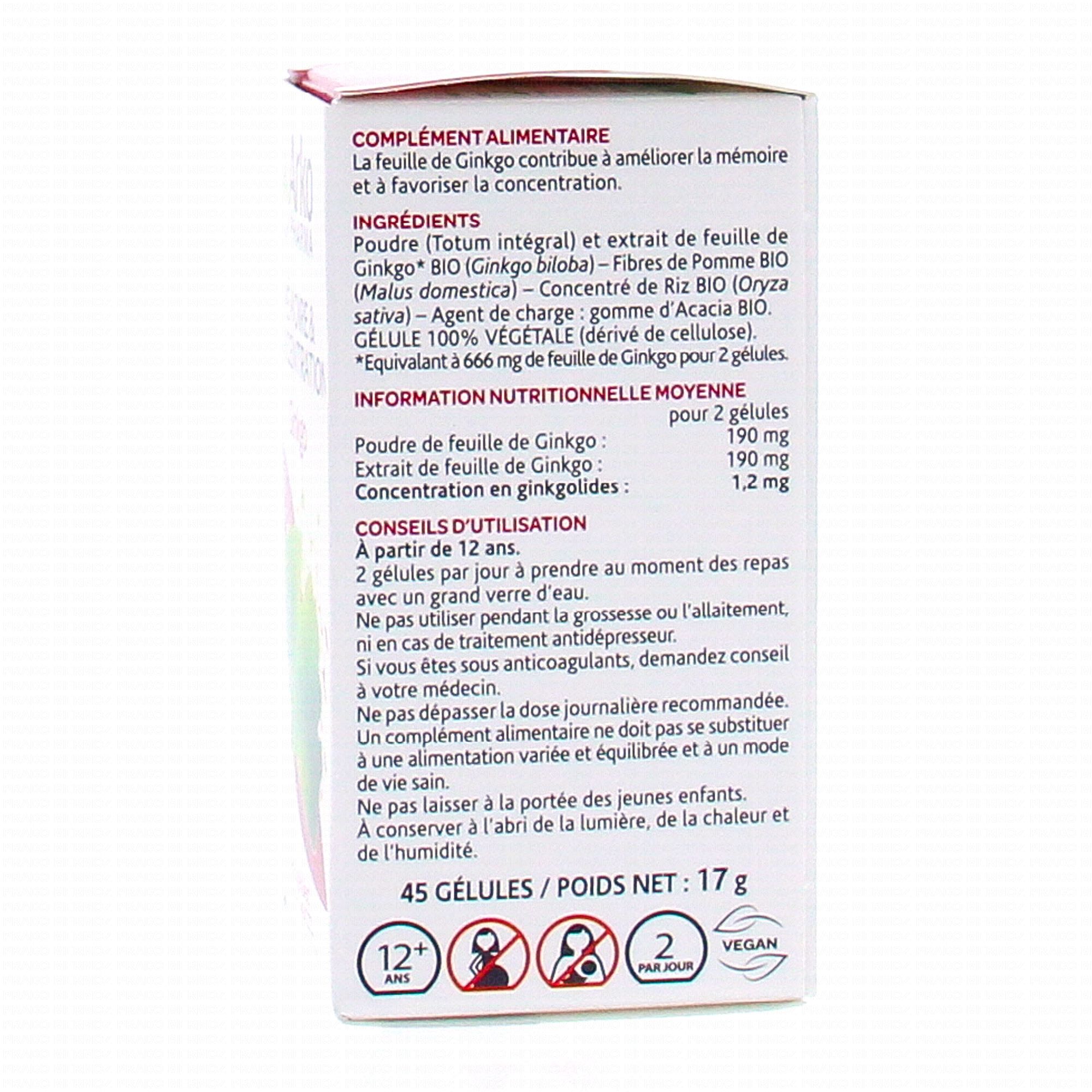 Poudre (Totum intégral) et extrait de feuille de Ginkgo* BIO (Ginkgo Biloba) Fibres de Pomme BIO (Malus Domestica) Concentré de riz BIO (Oryza Sativa) Agent de charge : gomme d'Acacia BIO GELULE 100% VEGETALE (dérivé de cellulose). *Equivalent à 666 mg de feuille de Ginkgo pour 2 gélules