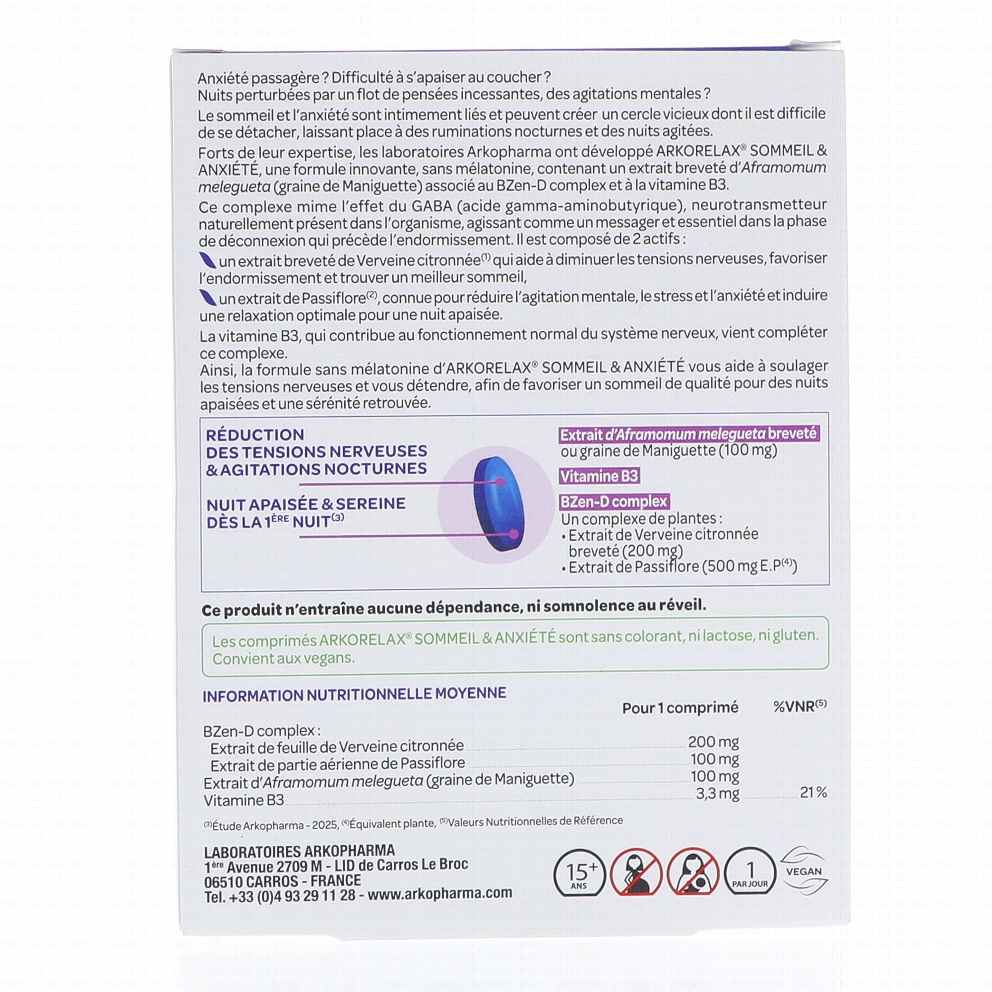 ARKOPHARMA Arkorelax - Sommeil & Anxiété x30 Comprimés contient les éléments suivants :
