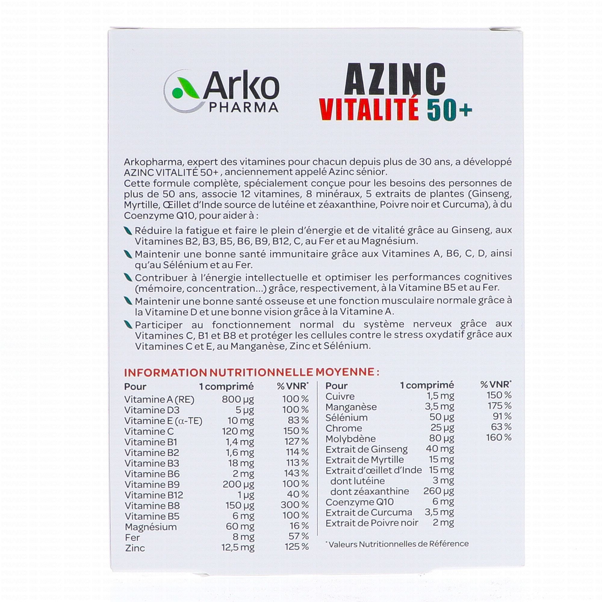 ARKOPHARMA Azinc Vitalité 50+ 30 comprimés contient les éléments suivants :