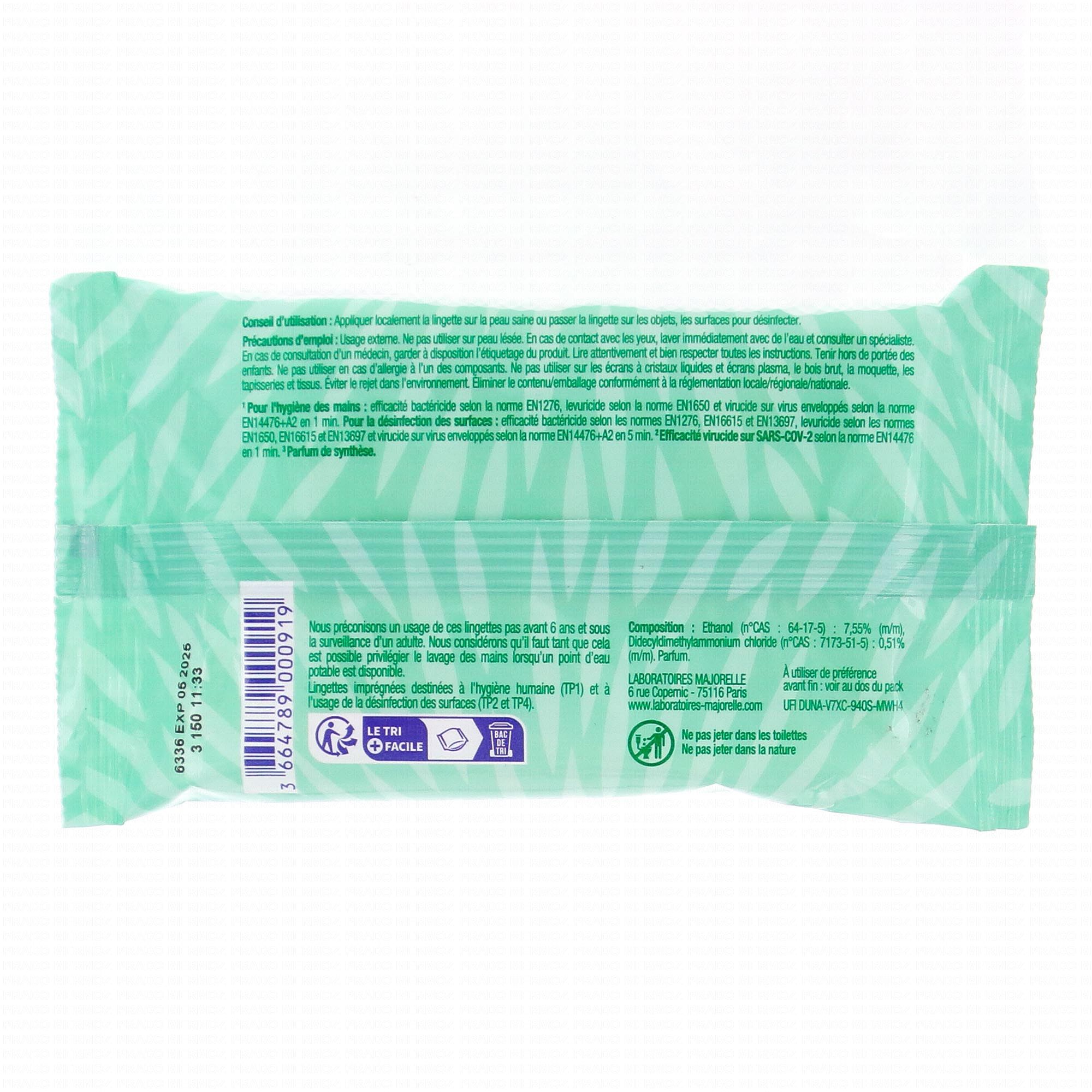 Lingettes désinfectantes mains et surfaces, élimine 99,9%des bactéries. Avec son format idéal elles peuvent être utilisées à tout moment laissant sur vos mains un parfum frais et léger.