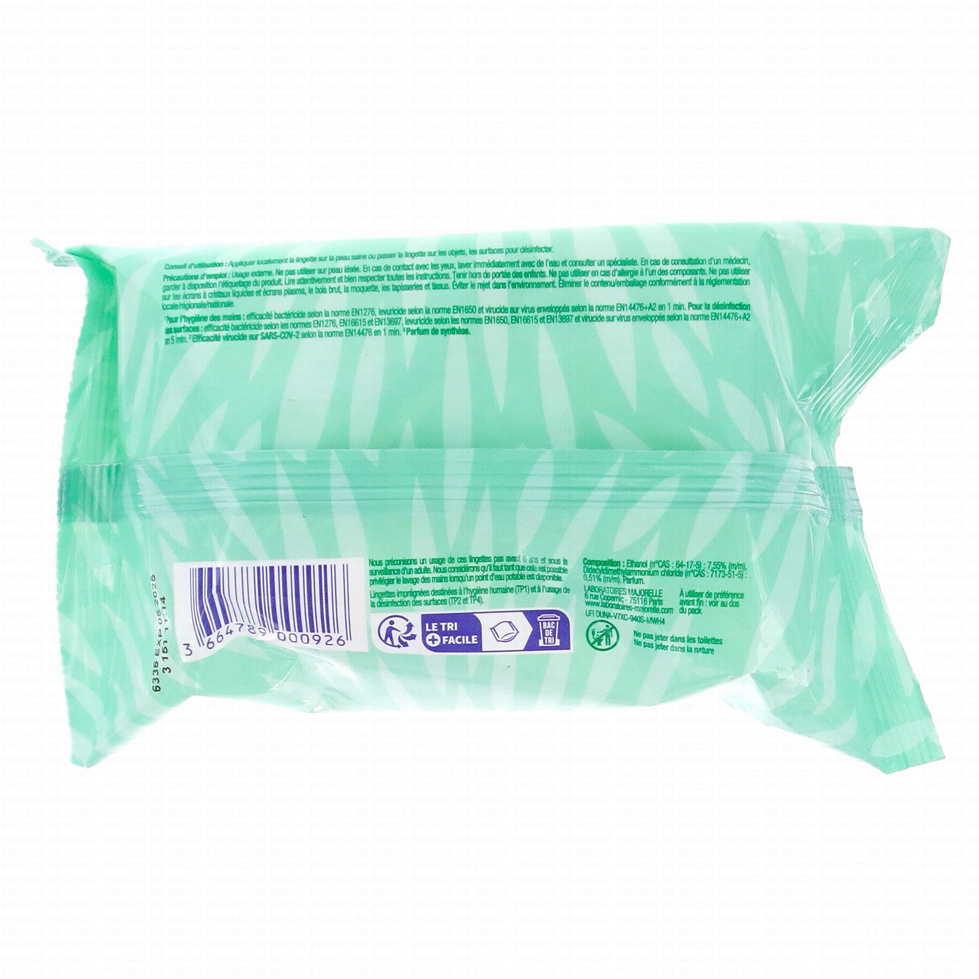 Lingettes désinfectantes mains et surfaces, élimine 99,9%des bactéries. Avec son format idéal elles peuvent être utilisées à tout moment laissant sur vos mains un parfum frais et léger.