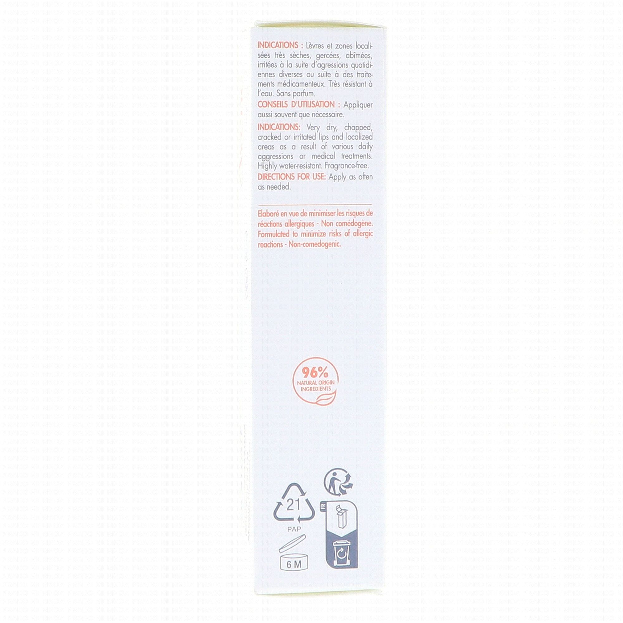 En cas de sécheresse et d'irritation des lèvres, de zones localisées du visage et du corps, appliquez Cicalfate Lèvres Baume réparateur aussi souvent que nécessaire.