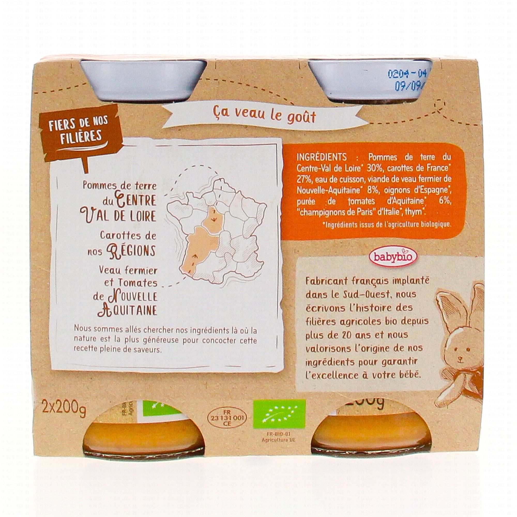 BABYBIO Petits pots Pomme de terre du Centre-Val de Loire, Carotte, Veau Fermier de Nouvelle-Aquitaine 2x200g dès 8 mois