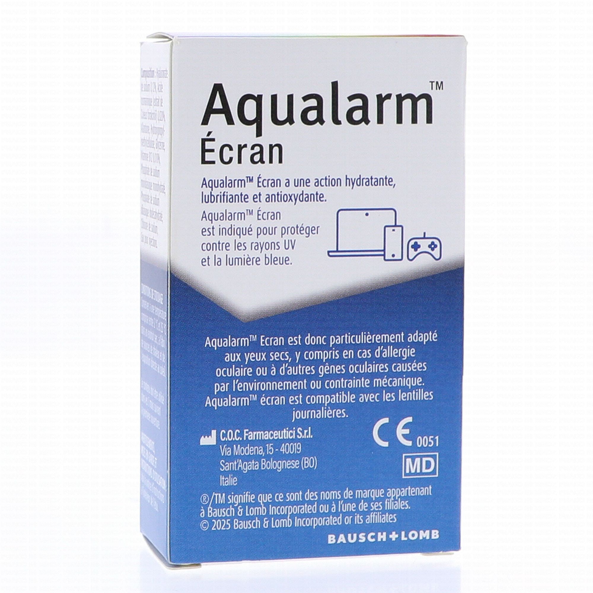 AQUALARM Écran Collyres 10ml Bausch + Lomb protège vos yeux des UV et de la lumière bleue tout en soulageant la sécheresse oculaire.