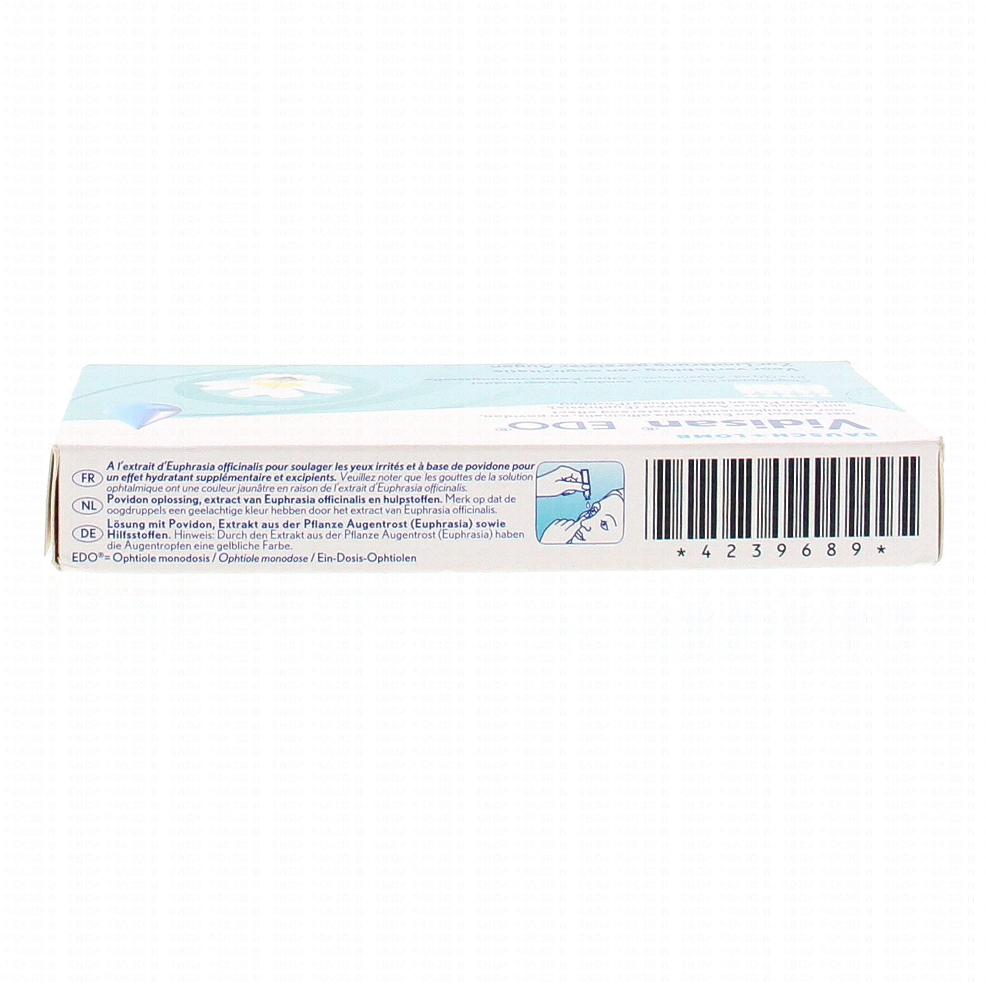 Le collyre Vidisan EDO apaise les irritations oculaires et protège les yeux des agressions extérieures en renforçant le film lacrymal. Son complexe allie Povidone et Euphraise et procure une sensation d'apaisement autour des yeux et déposera sur la surface de l'oeil une barrière protectrice contre les agressions extérieures. Le collyre Visidan EDO a été conçu pour respecter le pH physiologique et n'est pas compatible avec les lentilles. Son format unidose est pratique à utiliser et assure une meilleure conservation du produit.