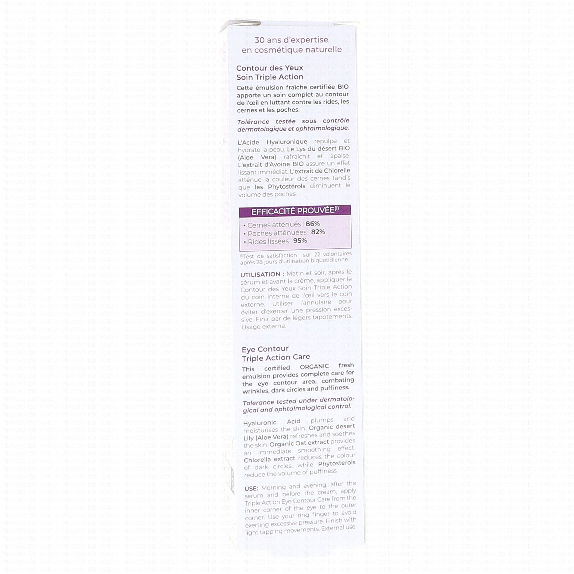 Émulsion anti-âge triple action pour le contour des yeux. Soin dermo relaxant, antiride, anti-cernes et anti-poches. Hydratant, apaisant, assouplissant, nourrissant, réparateur et protecteur. Texture fraîche, fondante, non grasse et pénétrante. Sans paraben, sans phénoxyéthanol, sans colorant, sans parfum de synthèse. Ingrédients issus de l'agriculture biologique certifiée Ecocert. Conditionnement : flacon pompe plastique. Péremption après ouverture : 6 mois.