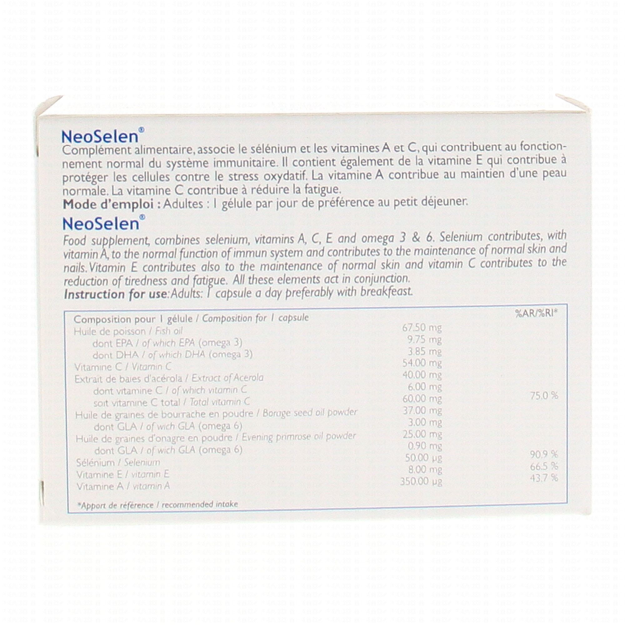 NEOSELEN 90 gélules est un complément alimentaire qui contribue à maintenir l'élasticité de la peau grâce à la présence de Levure de Bière. L'Huile d'Onagre aide à maintenir l'apparence propre de la peau, aide à maintenir l'élasticité, la tendresse et la santé de la peau. Le Sélénium et la Vitamine C favorisent la protection des cellules contre le stress oxydatif.