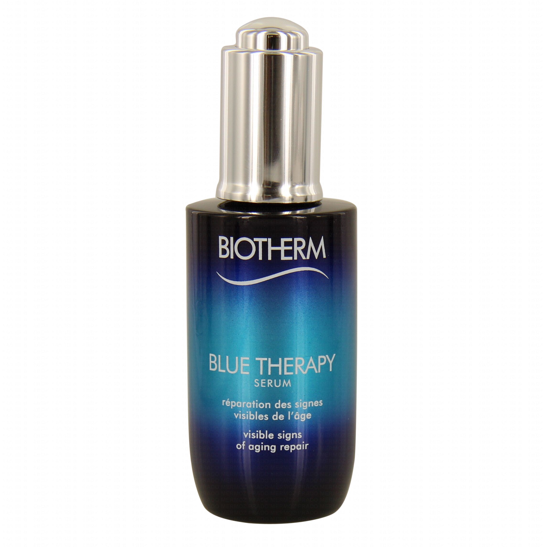 Les études effectuée dans les laboratoirs Biotherm démontrent que le sérum Blue Therapy agit efficacement en quatre semaines seulement pour réparer les signes de l'âge et estomper rides et ridules. Son triple agent actif ( A. Flos-Aquae, L. Ochroleuca et le Plancton Thermal Pur ) renforce les barrières cutanées naturelles tout en tonifiant la peau du visage et du cou.
