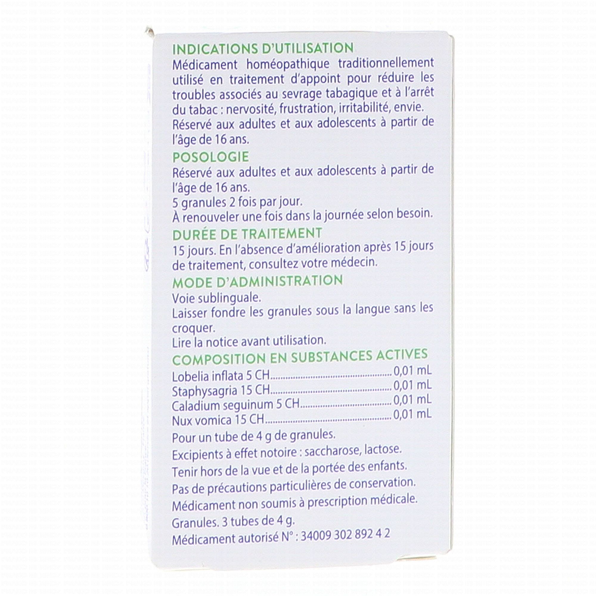 Médicament homéopathique traditionnellement utilisé en traitement d'appoint pour réduire les troubles associés au sevrage tabagique et à l'arrêt du tabac : nervosité, frustration, irritabilité, envie.
