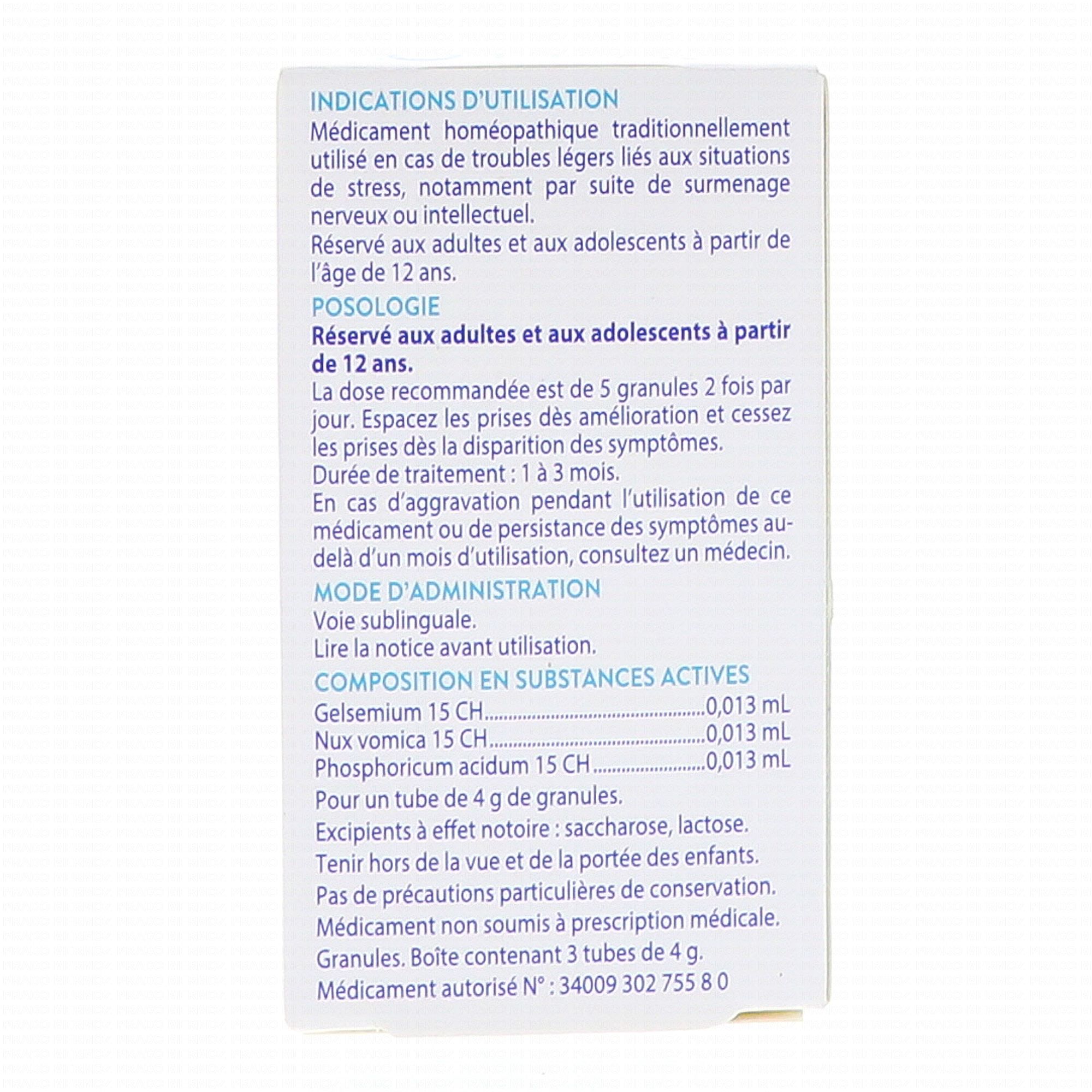 Médicament homéopathique traditionnellement utilisé en cas de troubles légers liés aux situations de stress, notamment par suite de surmenage nerveux ou intellectuel.
