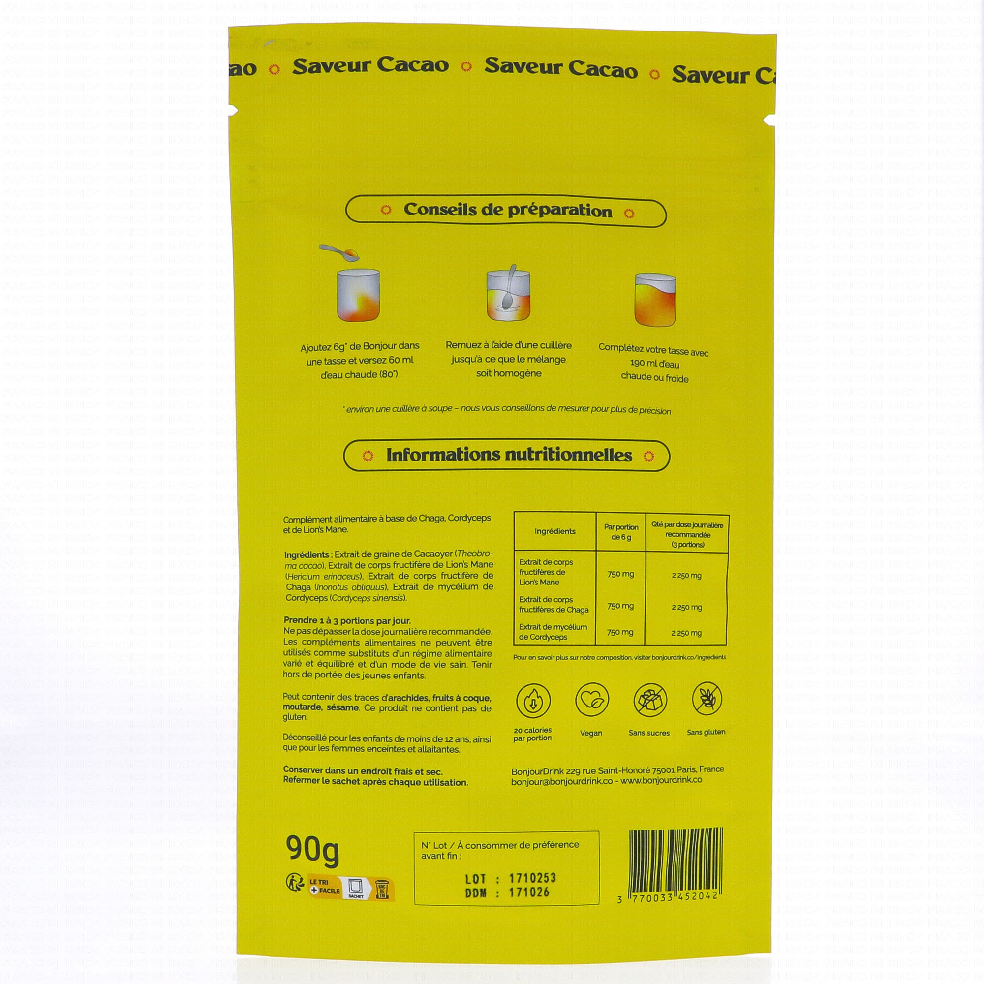 BONJOUR Saveur Cacao est une alternative au café à la formule unique, 100% naturelle, aux extraits concentrés de champignons adaptogènes. Cette préparation au goût de cacao est sans gluten, vegan, sans lactose, sans sucres et sans additifs.
