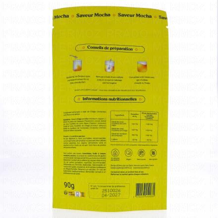 Extrait d'Orge torréfiée (Hordeum vulgare), Extrait de graine de Cacaoyer (Theobroma cacao), Extrait de corps fructifère de Lion's Mane (Hericium erinaceus), Extrait de corps fructifère de Chaga (Inonotus obliquus), Extrait de mycélium de Cordyceps (Cordyceps sinensis), Extrait de grain de café vert (Coffea arabica L.).