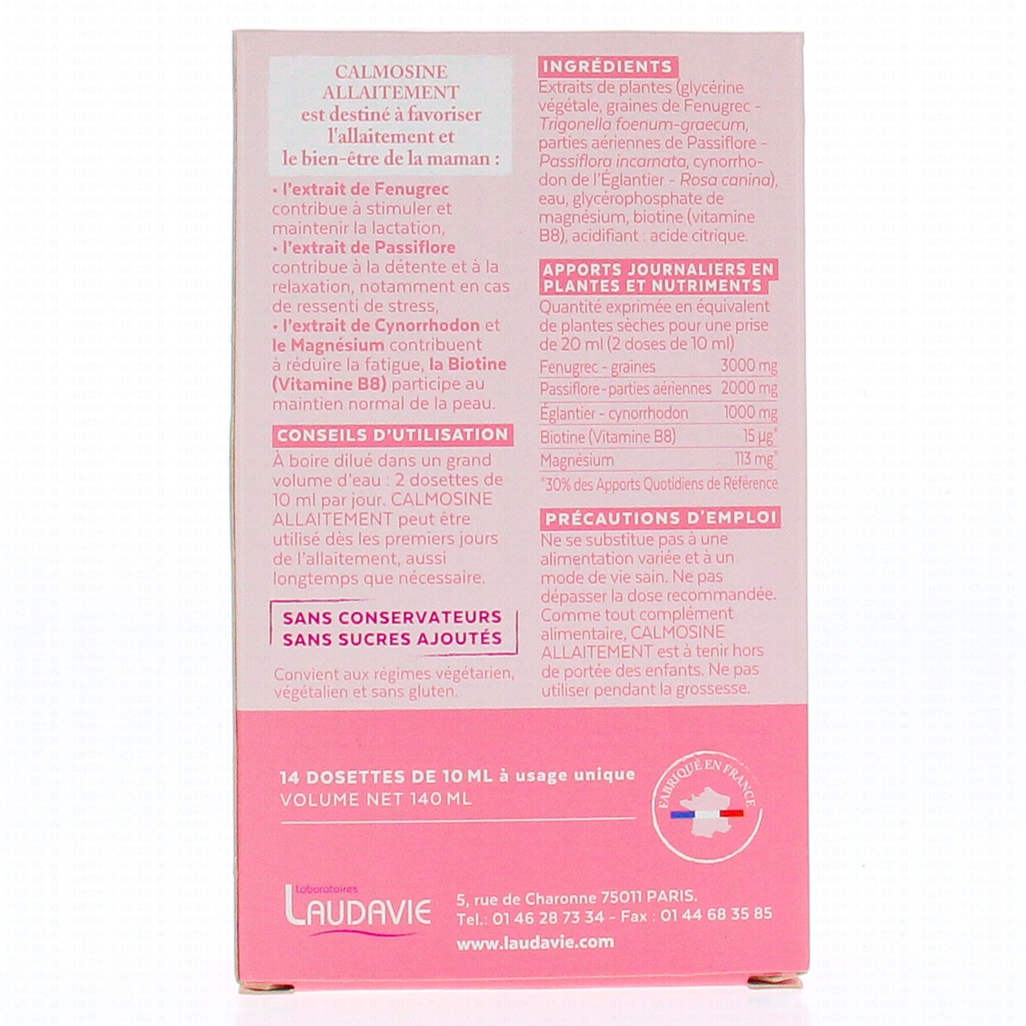 A boire dilué dans un grand volume d'eau : 2 dosettes de 10 ml par jour. Calmosine Allaitement peut être utilisé dès les premiers jours de l'allaitement, aussi longtemps que nécessaire.