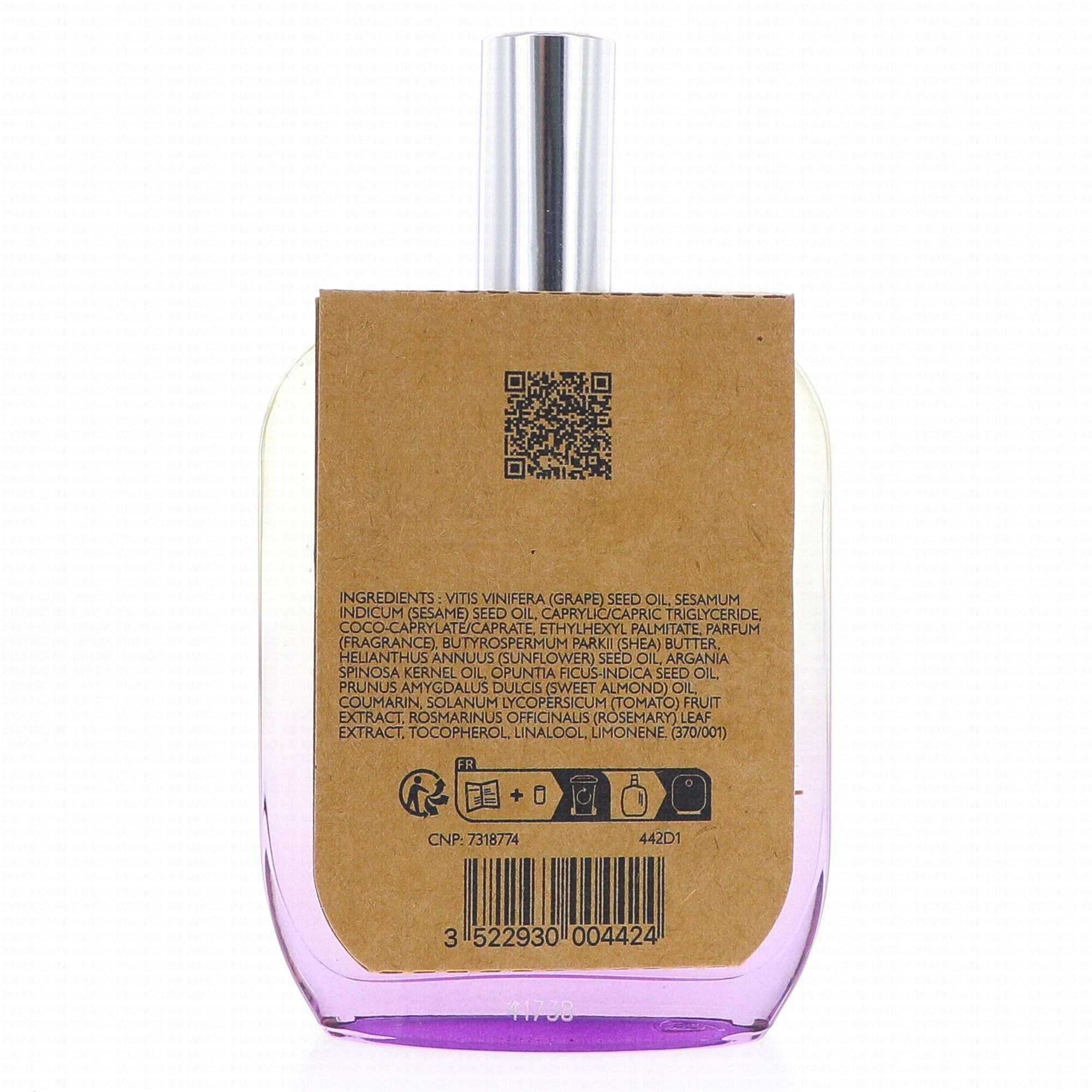 Vitis Vinifera (Grape) Seed Oil, Sesamum Indicum (Sesame) Seed Oil, Caprylic/Capric Triglyceride, Coco-Caprylate/Caprate, Ethylhexyl Palmitate, Parfum (Fragrance), Butyrospermum Parkii (Shea) Butter, Helianthus Annuus (Sunflower) Seed Oil, Argania Spinosa Kernel Oil, Opuntia Ficus-Indica Seed Oil, Prunus Amygdalus Dulcis (Sweet Almond) Oil, Coumarin, Solanum Lycopersicum (Tomato) Fruit Extract, Rosmarinus Officinalis (Rosemary) Leaf Extract, Tocopherol, Linalool, Limonene.