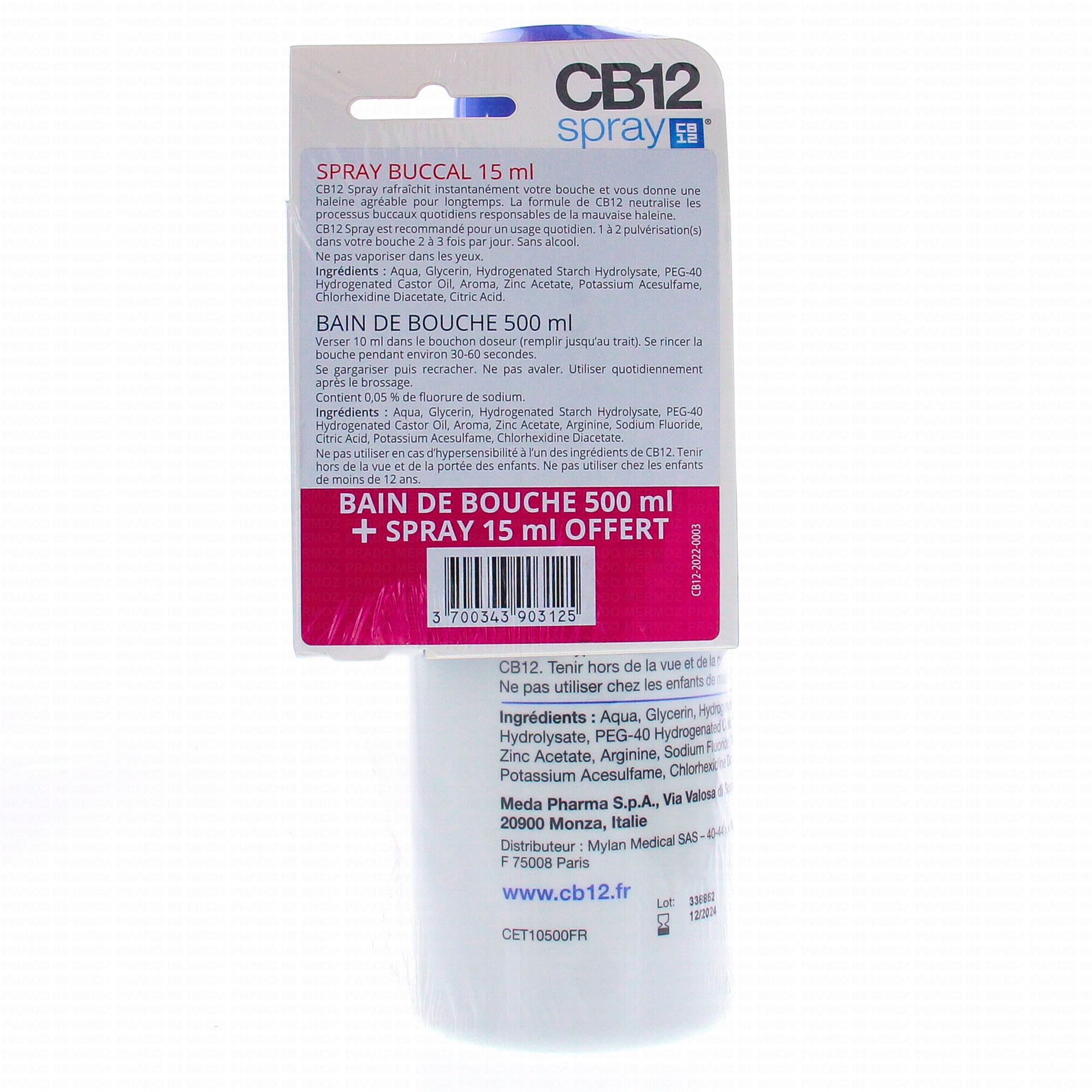 - CB12 Bain de Bouche 500 ml est un soin bucco-dentaire à base de menthe, qui agit contre l'origine de la mauvaise haleine et prévient sa réapparition en neutralisant les composés sulfurés volatils dans la bouche.