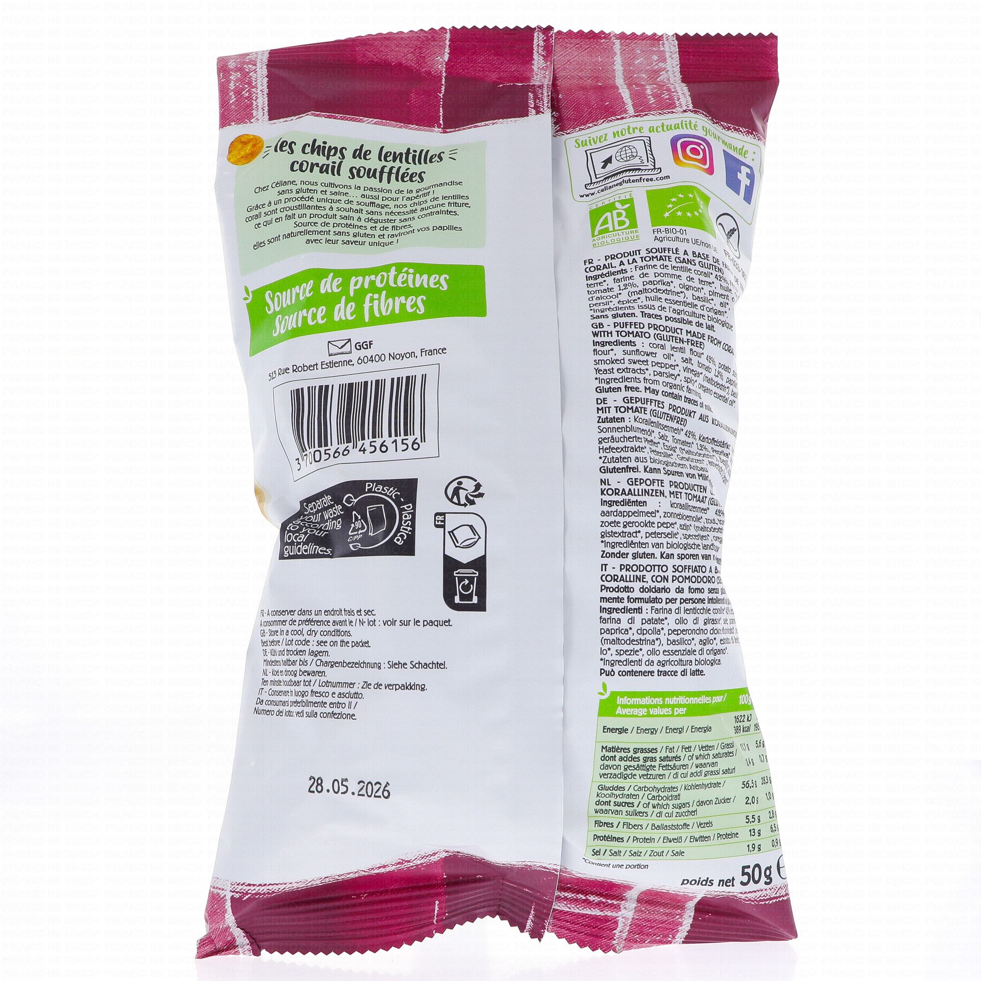 Farine de lentille corail* 42%, Fécule de pomme de terre*, farine de pomme de terre*, huile de tournesol*, sel, tomate en poudre* 1,2%, paprika*, oignon*, piment doux fumé*, vinaigre d'alcool (maltodextrine*), basilic*, ail*, extraits de levures*, persil*, épice*, huile essentielle d'origan*.