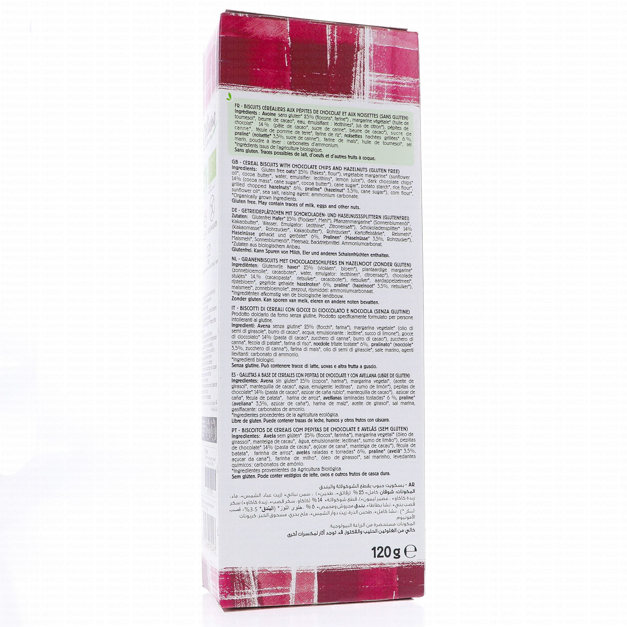 Avoine sans gluten* 25% (flocons*, farine*), huile de tournesol*, sucre de canne*, pépites de chocolat* 11,5% (pâte de cacao*, sucre de canne*, beurre de cacao*), fécule de pomme de terre*, praliné noisette* (noisette* 4,5%, sucre de canne*), farine de riz*, farine de maïs*, noisettes hachées grillées* 4%, sel marin, poudre à lever : carbonates d'ammonium.