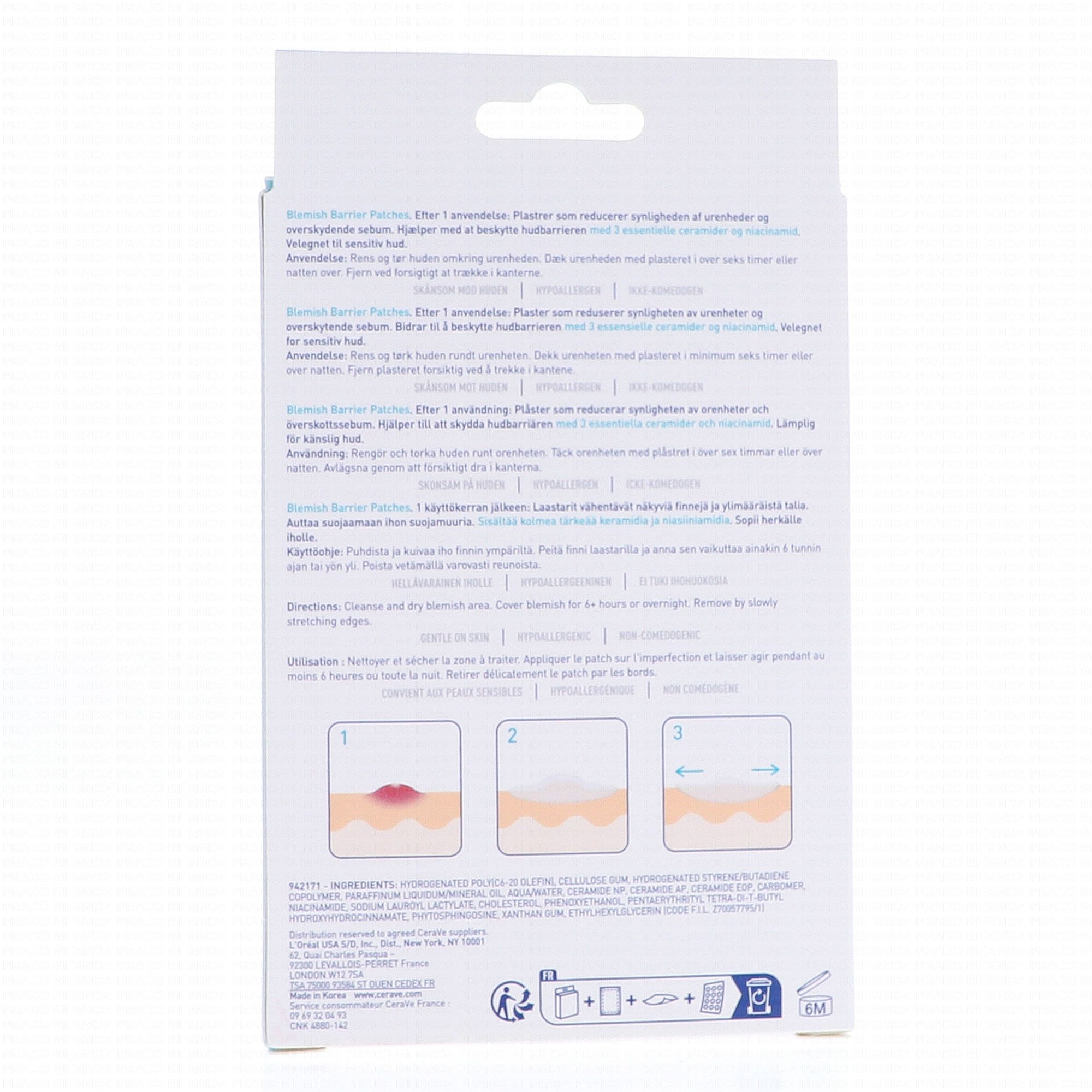 Les patchs anti-imperfections CeraVe sont conçus pour cibler rapidement et efficacement les boutons et imperfections ponctuelles. Grâce à leur technologie hydrocolloïde, ils agissent comme un pansement absorbant qui aide à extraire les impuretés tout en protégeant la peau des agressions extérieures, réduisant ainsi le risque de contamination ou de manipulation. Enrichis en ingrédients reconnus comme l'acide salicylique et la niacinamide, ils contribuent à apaiser, purifier et favoriser la réparation cutanée sans dessécher la peau. Leur format discret et transparent permet de les porter aussi bien de jour que de nuit, et leur adhérence assure un maintien optimal sur la peau. Faciles à utiliser, ces patchs sont une solution pratique et hygiénique pour réduire l'apparence des boutons en quelques heures.