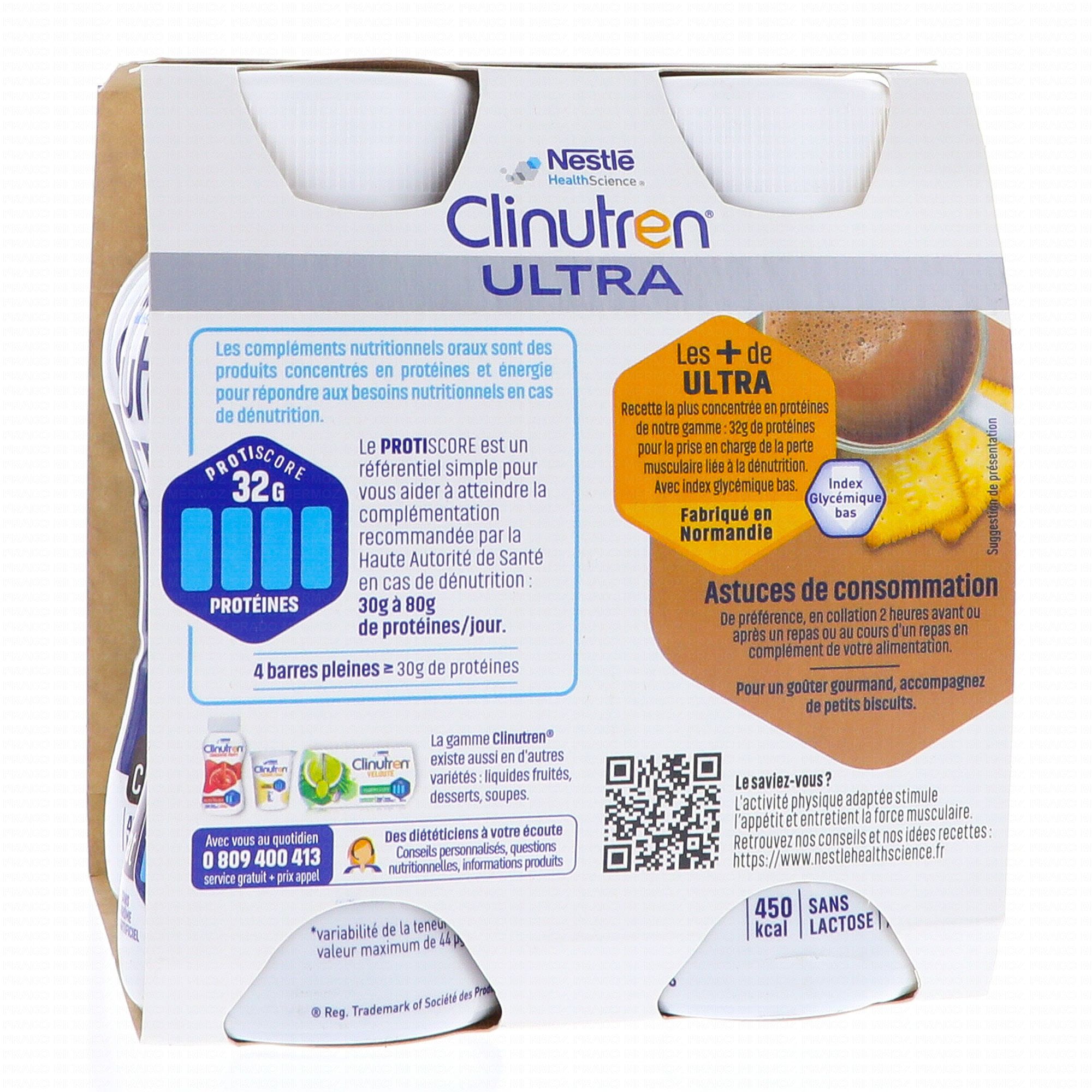 CLINUTREN Ultra concentré en protéines Saveur Chocolat 4x200ml est une boisson hyperprotéinée et hypercalorique saveur chocolat qui est destinée aux personnes souffrants de dénutrition ou en voie de dénutrition. Chaque boisson apporte 32 grammes de protéines et 450kcal. C'est une boisson sans lactose.