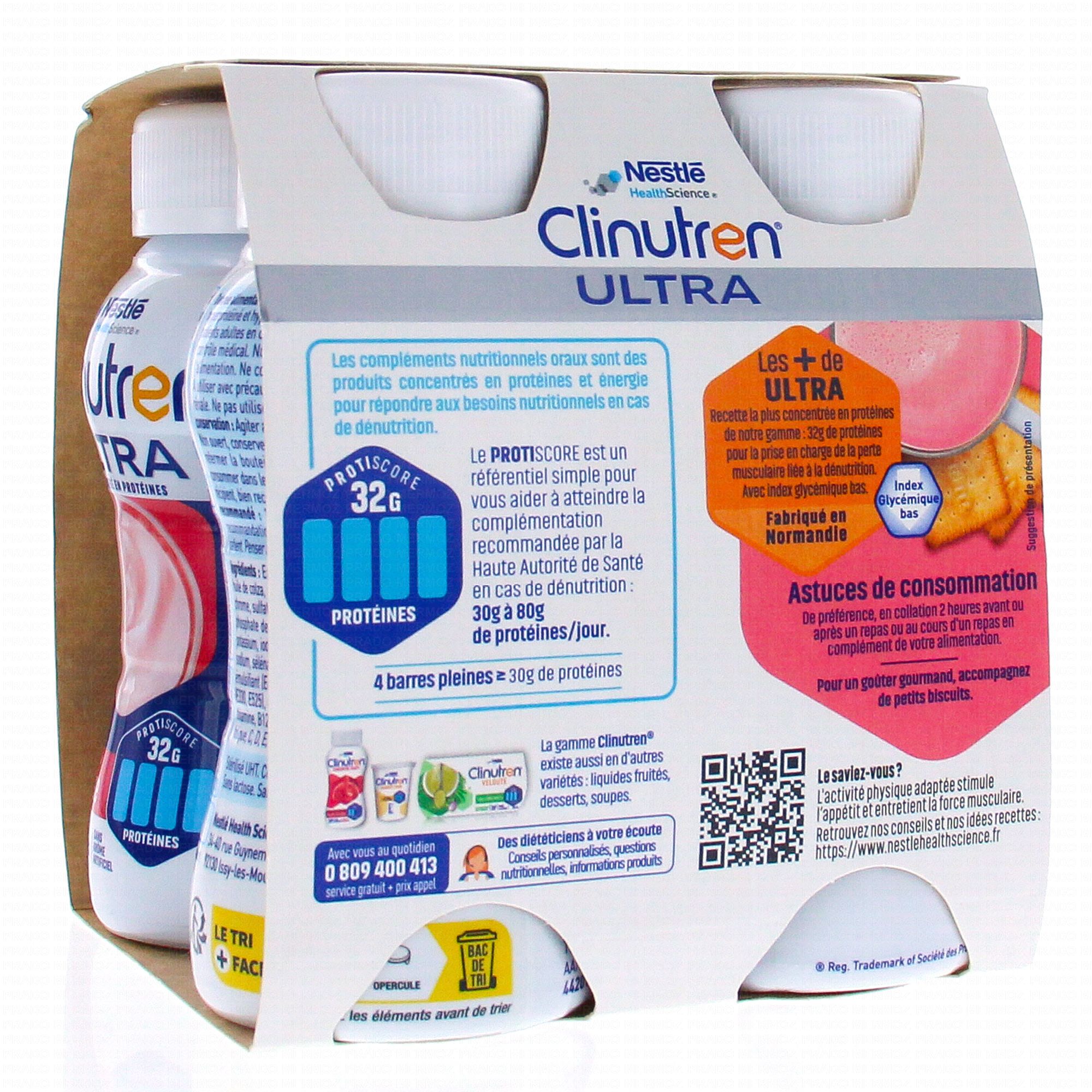 CLINUTREN Ultra concentré en protéines saveur fraise sans lactose 4x200ml est un complexe hyperprotéiné et hypercalorique indiqué en cas de dénutrition ou de risque de dénutrition. Une bouteille de 200ml apporte 450kcal et 32g de protéines et elle ne contient pas de lactose.