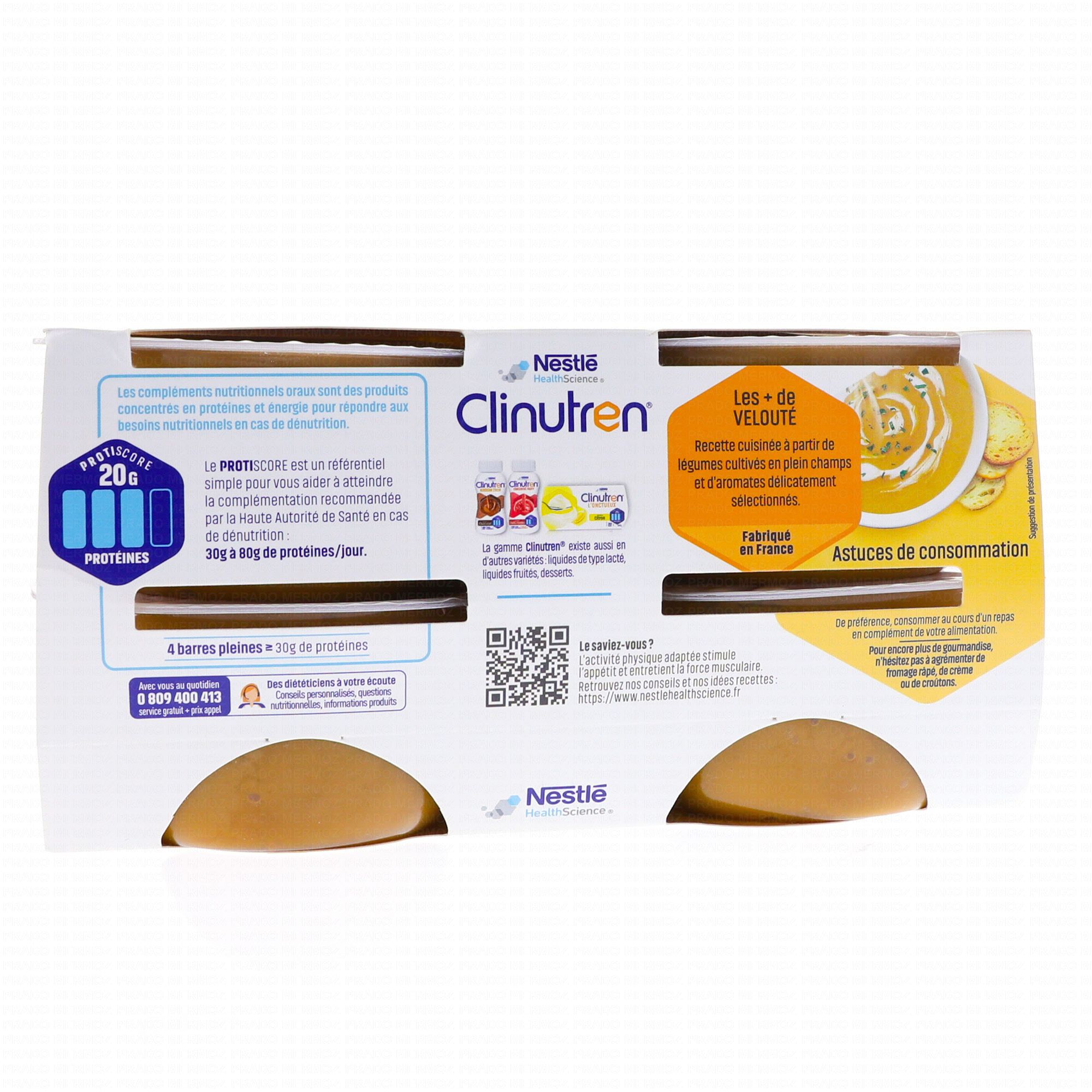 CLINUTREN Velouté Poireaux, Pommes de terre 4x200ml est une préparation hyperprotéinée et hypercalorique destinée aux personnes souffrants de dénutrition ou en voie de dénutrition. Chaque portion apporte 20 grammes de protéines et 360kcal.