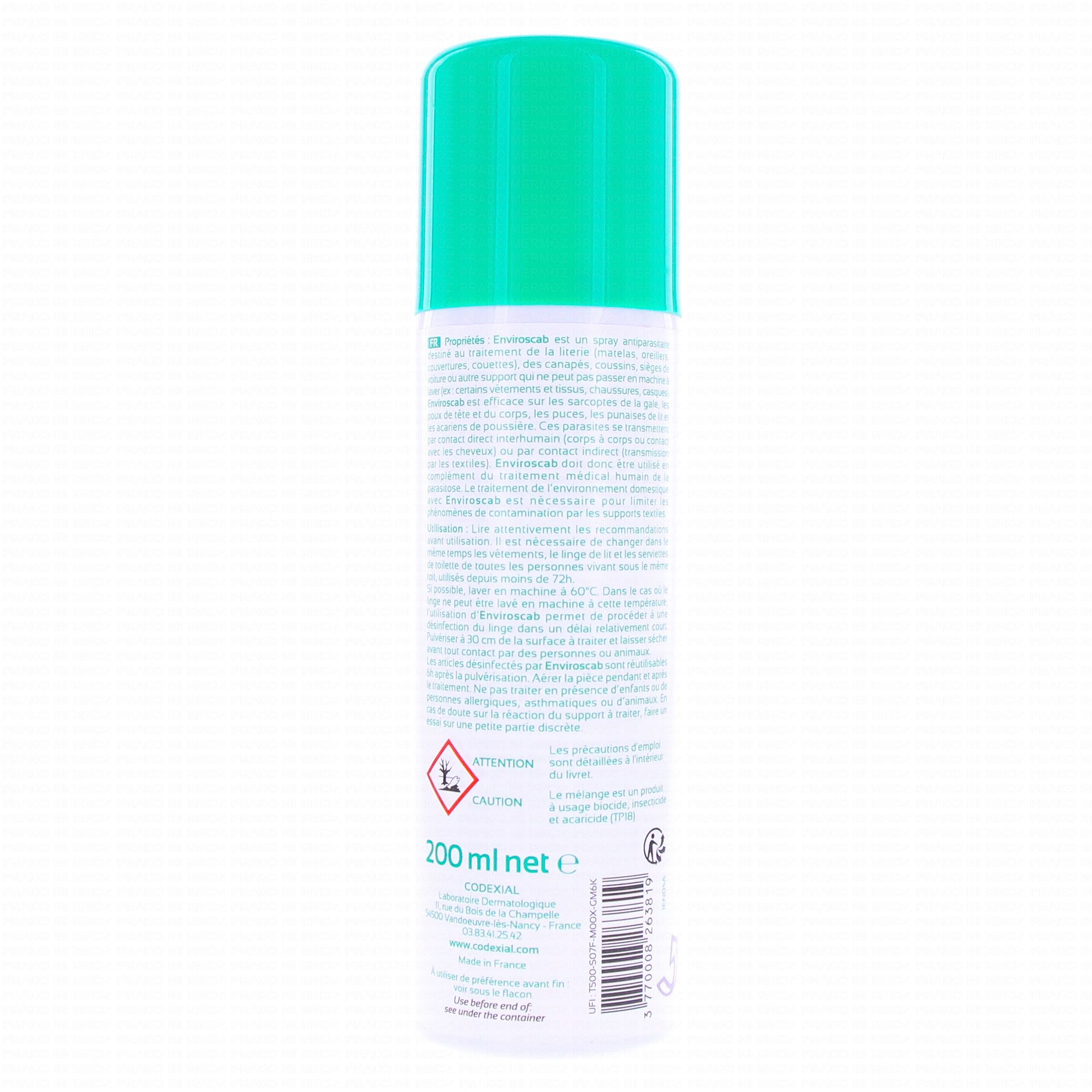 L'aérosol antiparasitaire Enviroscab Codexial est destiné au traitement de l'environnement domestique, comme la literie, les canapés ou les sièges de voitures. Il peut être utilisé, d'une manière générale, sur tous les tissus qui ne peuvent pas être lavés en machine ou sur les articles difficiles à laver comme les couettes, les oreillers ou les chaussures. Son action biocide s'exerce sur les punaises de lit, les poux, les puces, les sarcoptes de la gale, ainsi que les acariens présents dans la poussière. Le principal ingrédient actif de cet aérosol antiparasitaire est la perméthrine, un insecticide de la famille des pyréthrinoïdes.