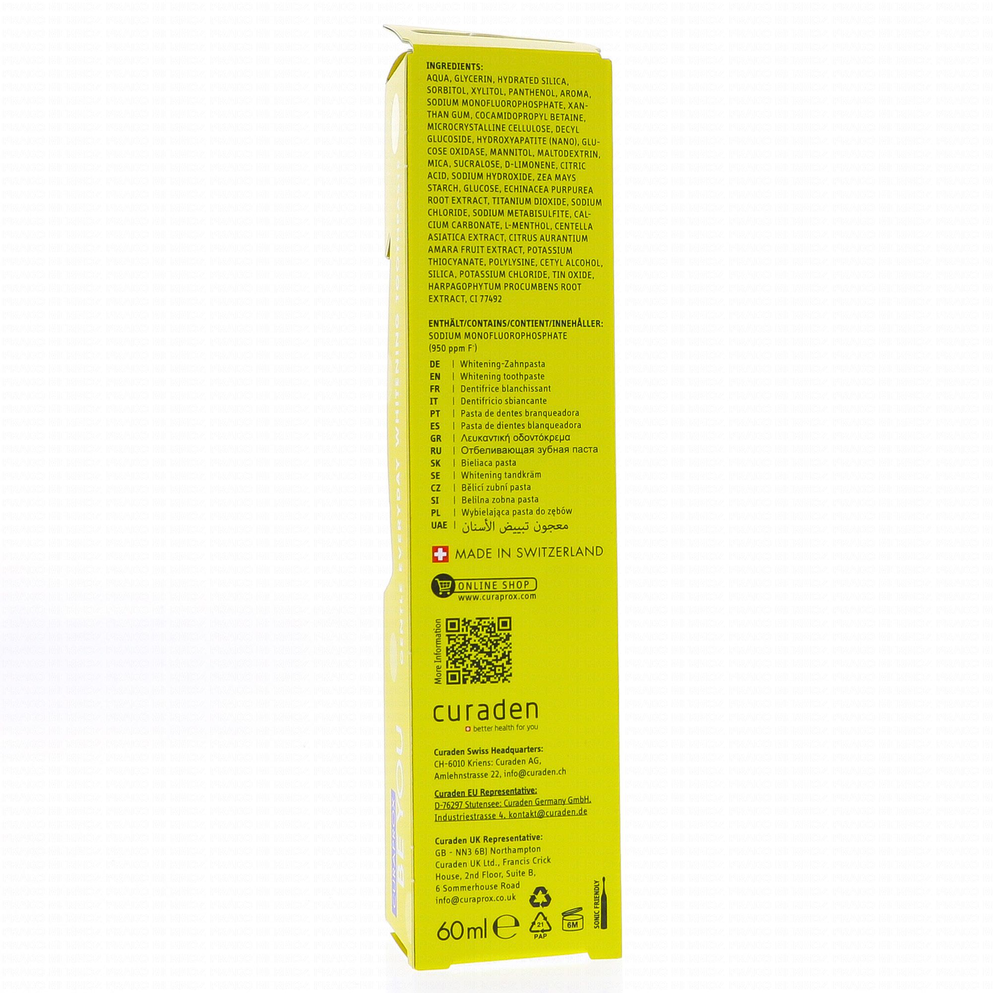 Eau, glycérine, silice hydratée, sorbitol, xylitol, panthénol, arôme, lauryl glucoside, cocamidopropyl bétaïne, gomme xanthane, glucose, cellulose microcristalline, hydroxyapatite (nano), glucose oxydase, amidon de Zea mays, mica, sucralose, monofluorhate de sodium, monofluorosphate de sodium Echinacea purpurea extrait de racine, dioxyde de titane, chlorure de sodium, mannitol, bisulfite de sodium, hydroxyde de sodium, carbonate de calcium, extrait de Centella asiatica, complexe de bioflavonoïdes d'agrumes, alcool cétylique, extrait de racine d' Harpagophytum procumbens, oxyde d'étain, silice, menthol, polylysine, D-limonène, linalol, CI 77492.