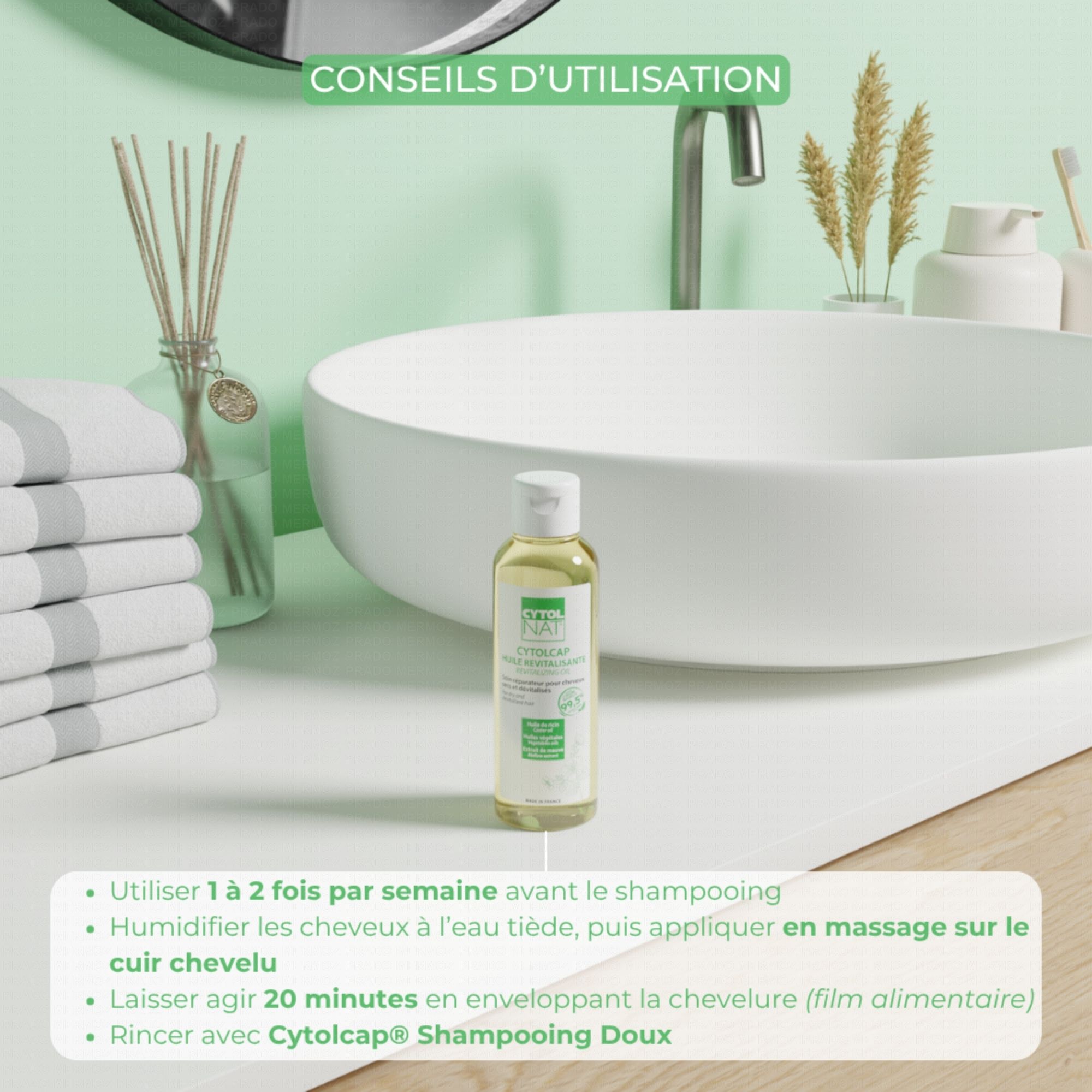 Appliquer Cytolcap Huile Revitalisante sur les cheveux humides une à deux fois par semaine. Bien masser la chevelure et le cuir chevelu pour faire pénétrer le produit. Mettre une serviette chaude enveloppant la chevelure et laisser agir 15 à 20 minutes. Rincer ensuite abondamment et procéder à un shampooing (Utiliser Cytolcap Shampooing Doux Revitalisant). Note: Après une exposition au soleil, un bain de mer ou piscine, qui ont tendance à dessécher les cheveux, il est conseillé de laisser agir l'huile pendant 30 à 45 minutes pour des résultats optimums