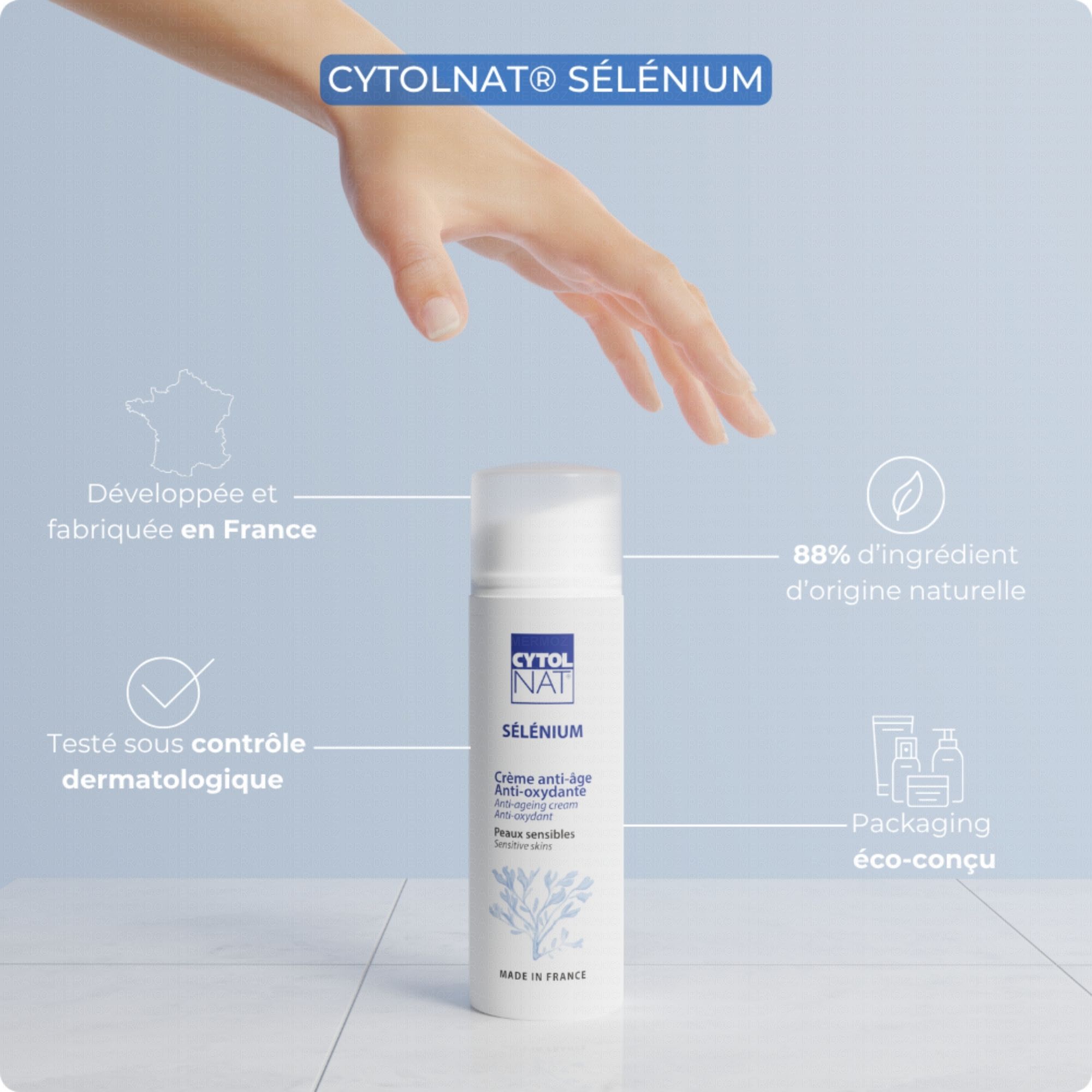 Par son activité hautement anti-oxydante, la crème de soin dermatologique anti-âge Cytolnat Sélénium améliore la tolérance de la peau face aux agressions extérieures (pollution, stress, traitements médicamenteux), prévient et ralentit efficacement le vieillissement cutané et renforce les défenses immunitaires cutanées.