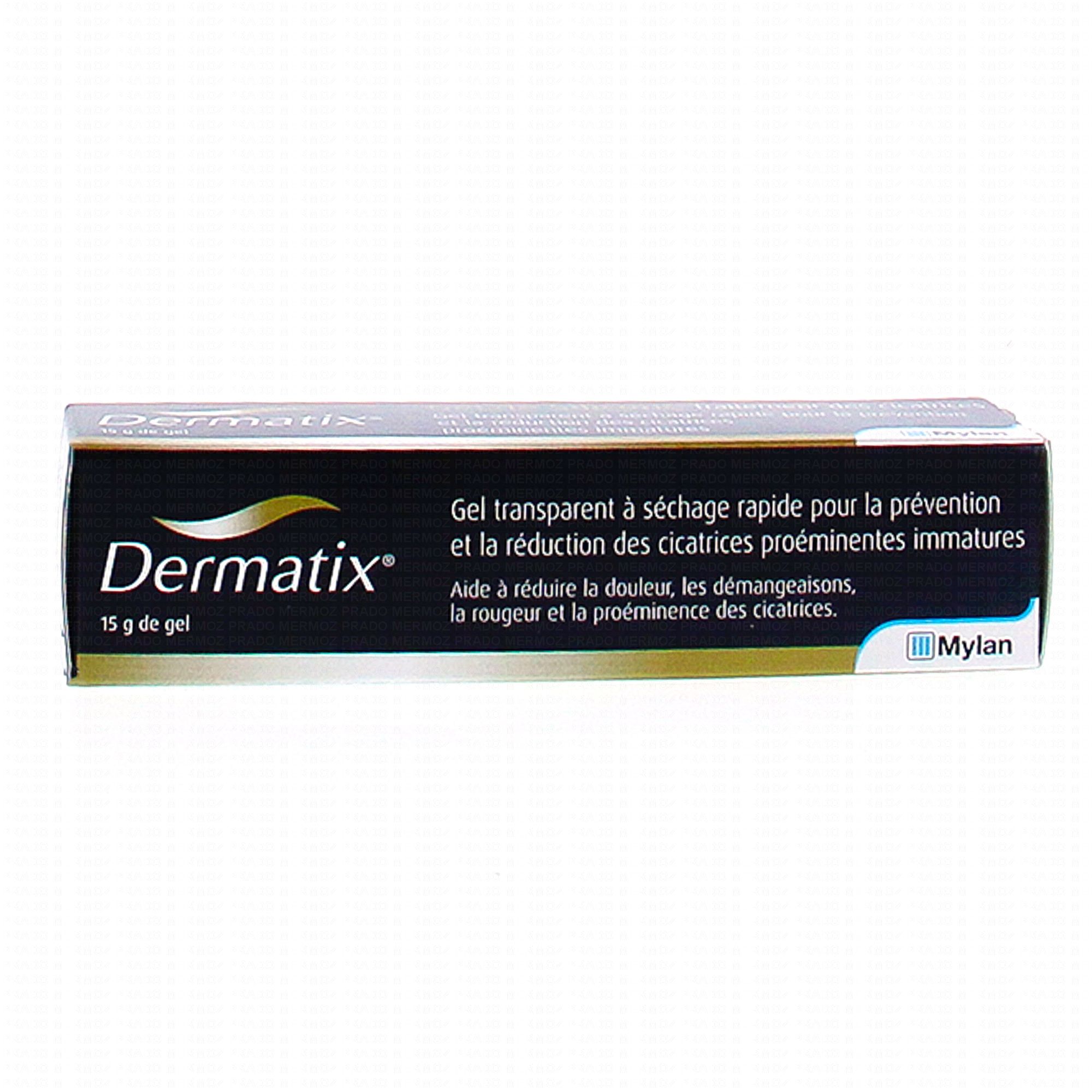 Dermatix est un gel transparent, séchant rapidement, qui contribue à maintenir l'équilibre hydrique de la peau, pour traiter les cicatrices qui résultent d'interventions chirurgicales, de brûlures et de plaies consécutives à des blessures. Il a été démontré que Dermatix applanit, adoucit et rend plus lisses les cicatrices.