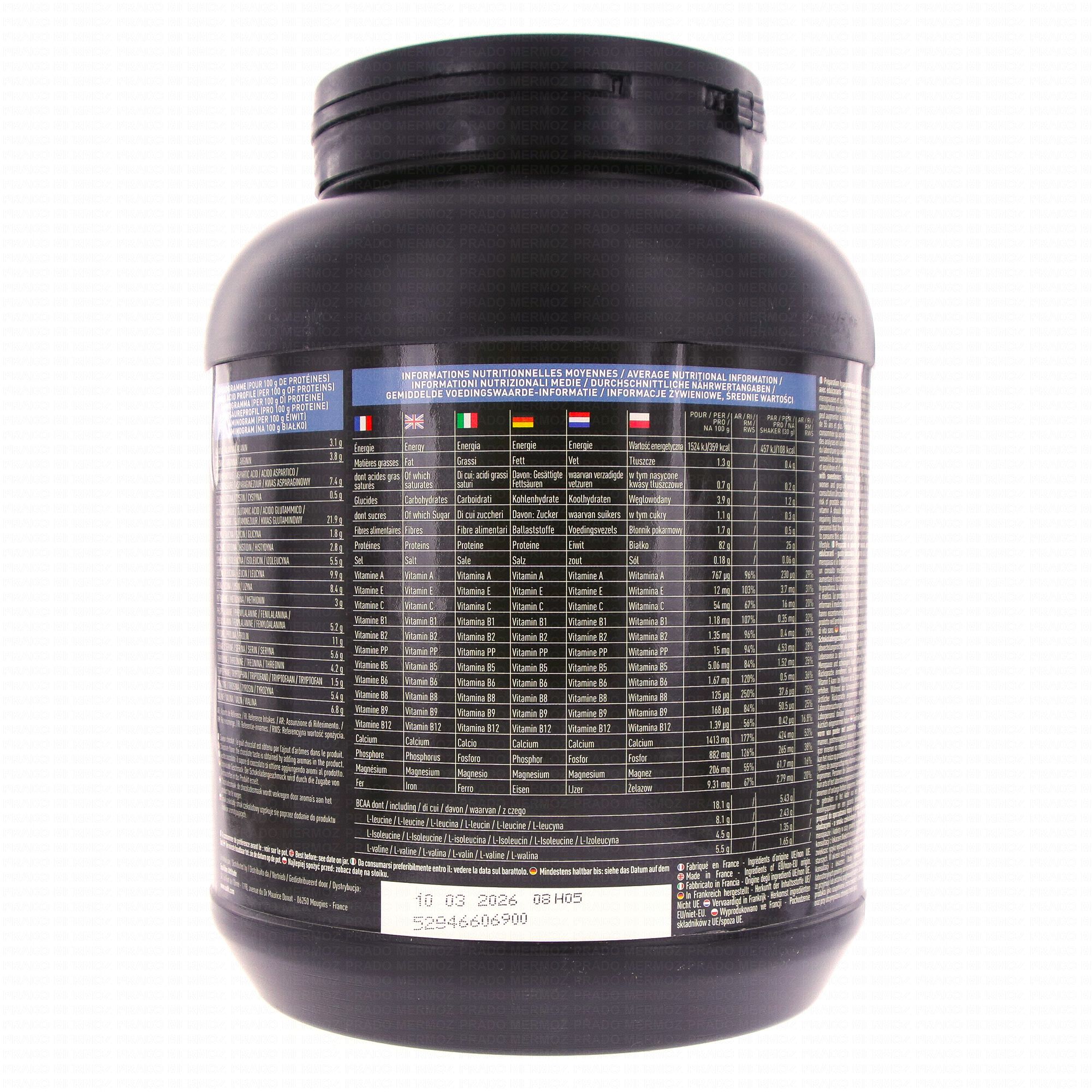 Ingrédients : Caséinates de calcium 59.69% (lait), isolat de protéines de lait 30%, poudre de cacao maigre 4.5%, arômes, poudre de blanc d'œuf 1.5%, minéraux : oxyde de magnésium - pyrophosphate de fer, épaississant : gomme xanthane, édulcorants : acésulfame de potassium - sucralose, vitamines : C, E, PP, A, B5, B6, B2, B1, B12, B9, B8, l-méthionine, maltodextrines, anti-agglomérant : silice.