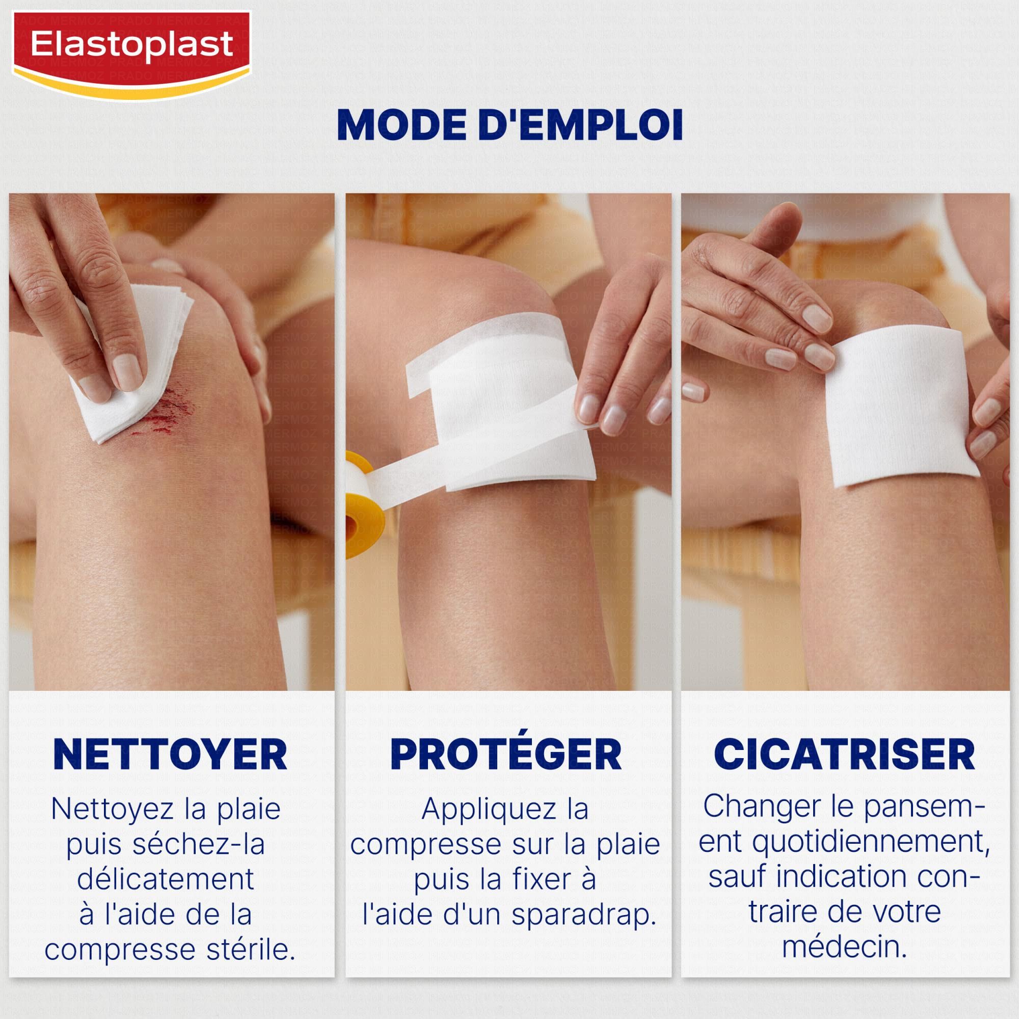 Nettoyer la plaie avec le Spray pour les plaies Elastoplast et sécher délicatement la peau avec une compresse non-tissée stérile Elastoplast. Appliquer la compresse et l'attacher avec du sparadrap ou une bande de fixation. Changer la compresse quotidiennement.