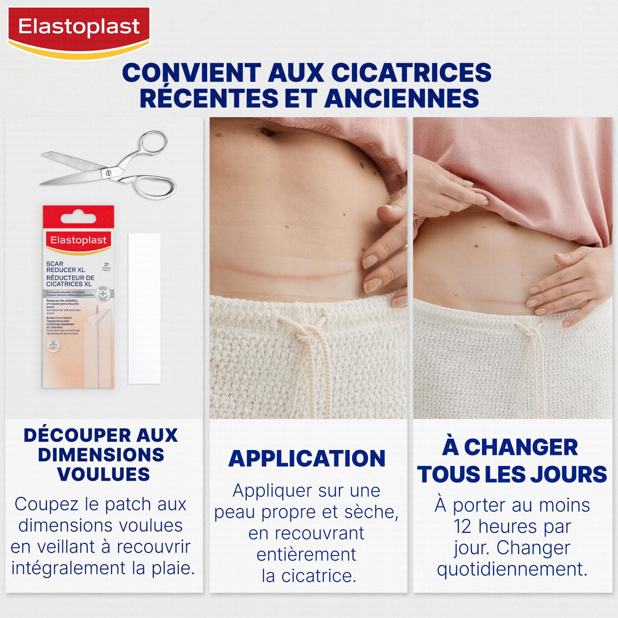 Aussi efficaces sur les cicatrices récentes que sur les anciennes, les pansements Réducteur de Cicatrices XL peuvent être utilisés sur le visage ou sur le corps. En construisant une barrière semi-occlusive qui améliore l'hydratation du tissu cicatriciel, il permet de favoriser la cicatrisation et s'utilise aussi bien sur les cicatrices issues d'une blessure que sur les cicatrices issues d'une opération chirurgicale. Après avoir soigneusement nettoyé la peau autour de la cicatrice, le pansement auto-adhésif se colle simplement en appuyant délicatement autour de la cicatrice.