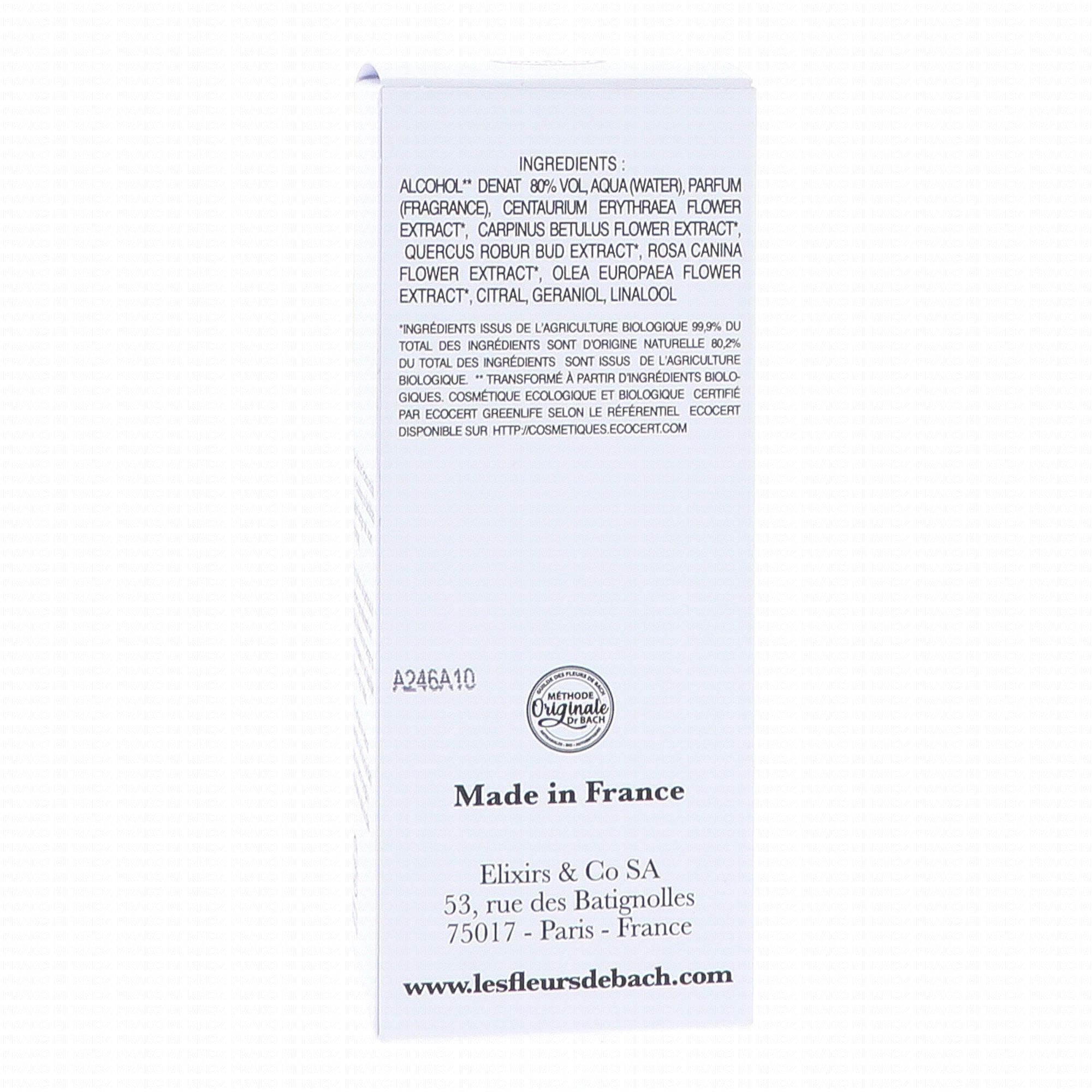 Organic Alcohol 80% Vol, Aqua (Water), Parfum (Frangrace), Centaurium Erythraea Flower Extract, Carpinus Betulus Flower Extract, Quercus Robur Bud Extract, Rosa Canina Flower Extract, Olea Europaea Flower Extract, Citral, Geraniol, Linalool.