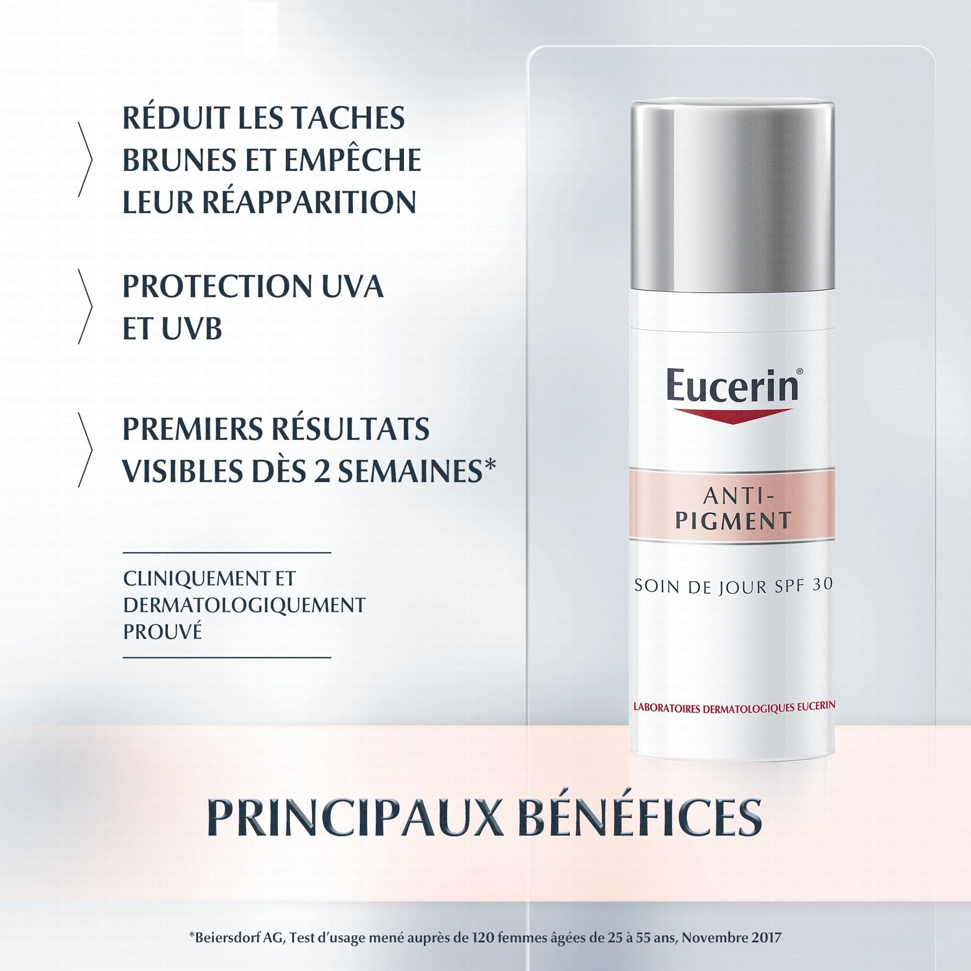 *Evaluation clinique pendant 12 semaines sur 34 volontaires, application conjointe des soins Eucerin® Anti-Pigment Sérum Duo et Soin de Jour SPF30 2 fois par jour pendant 12 semaines.