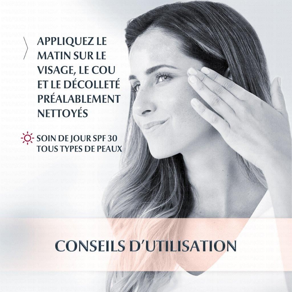 Ce Soin de Jour SPF 30 haute protection permet d'atténuer les taches brunes, et empêche leur réapparition. Il aide à unifier votre teint et à avoir une peau plus éclatante