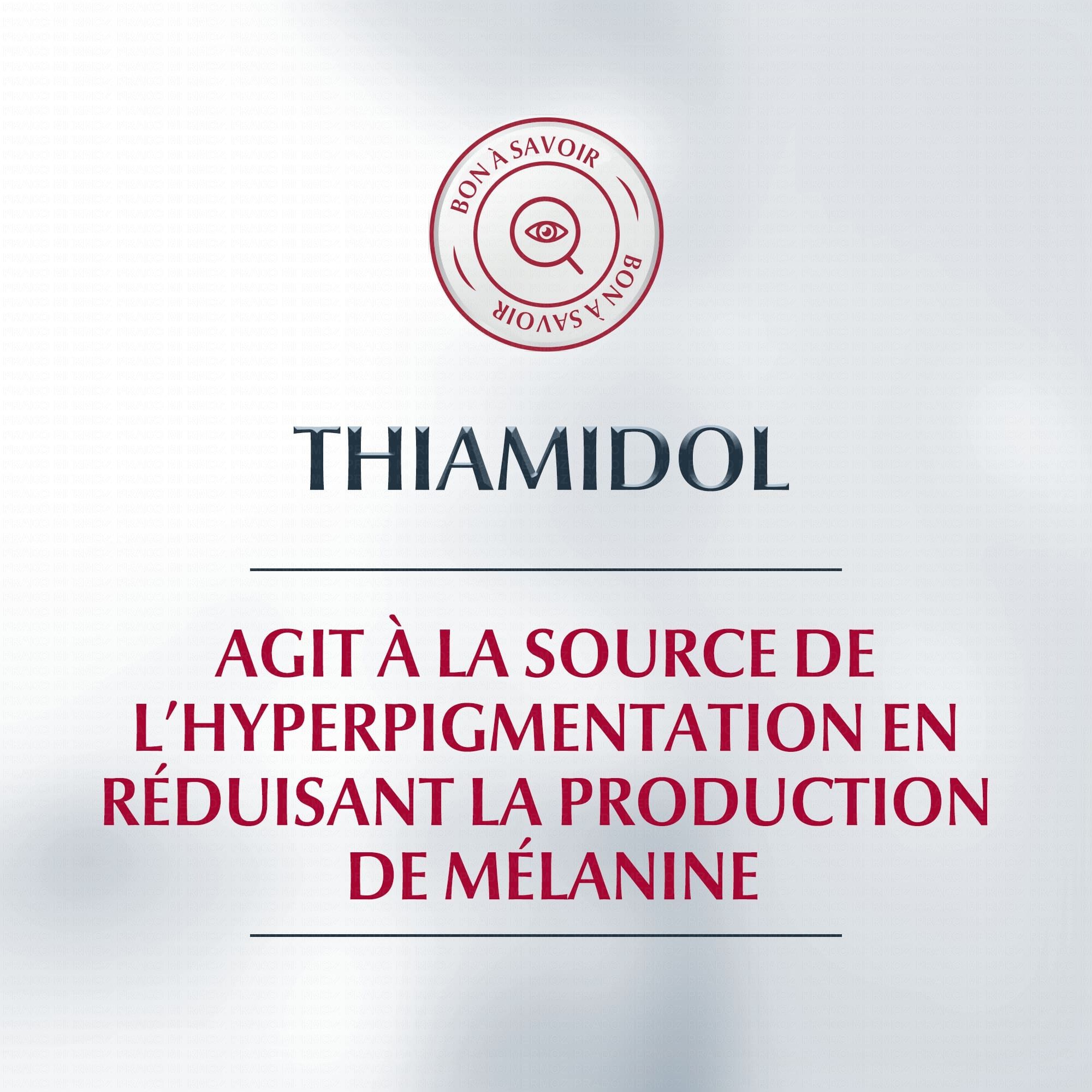 - Du Thiamidol, actif breveté et efficace pour lutter contre l'hyperpigmentation en réduisant la production de mélanine, responsable de l'apparition des taches brunes