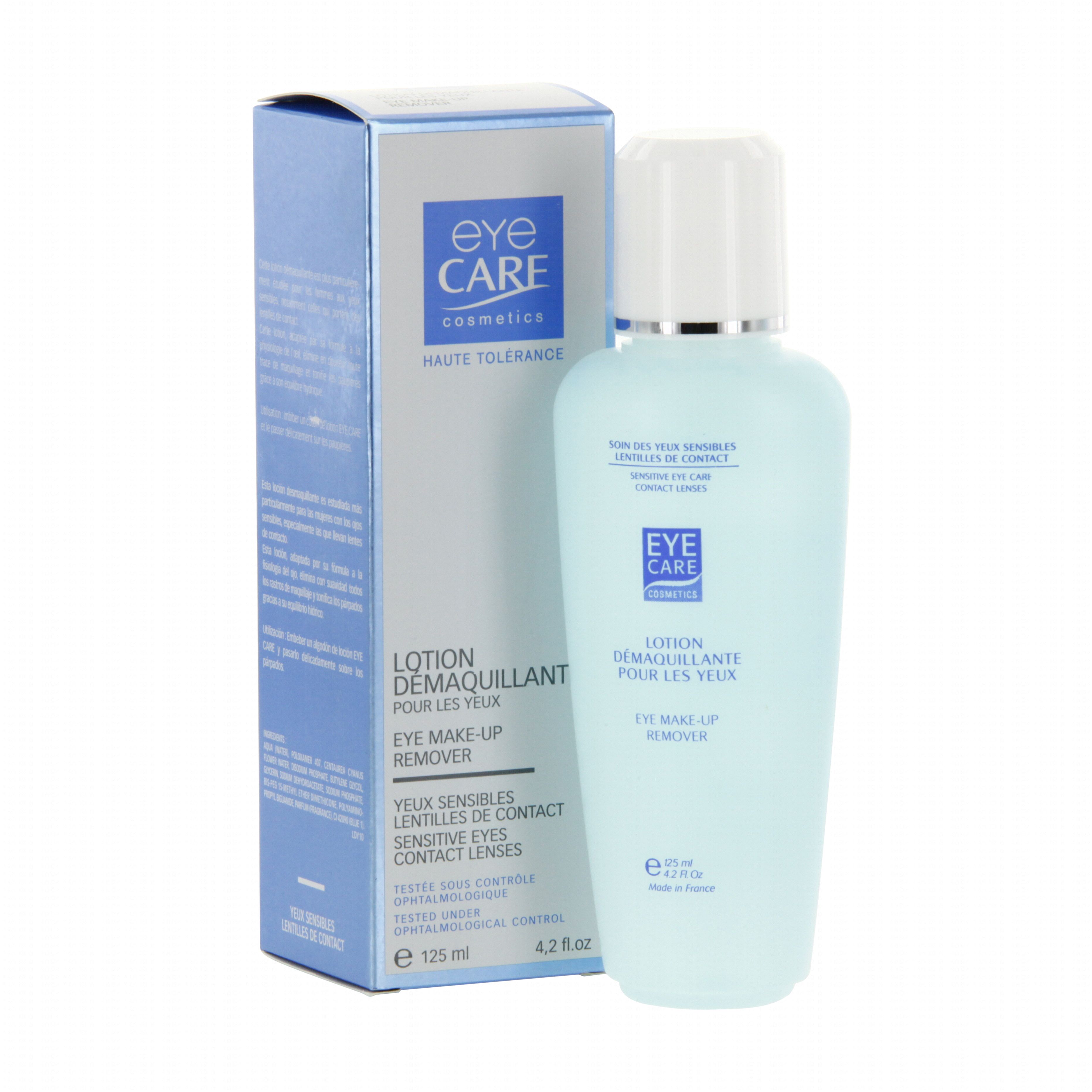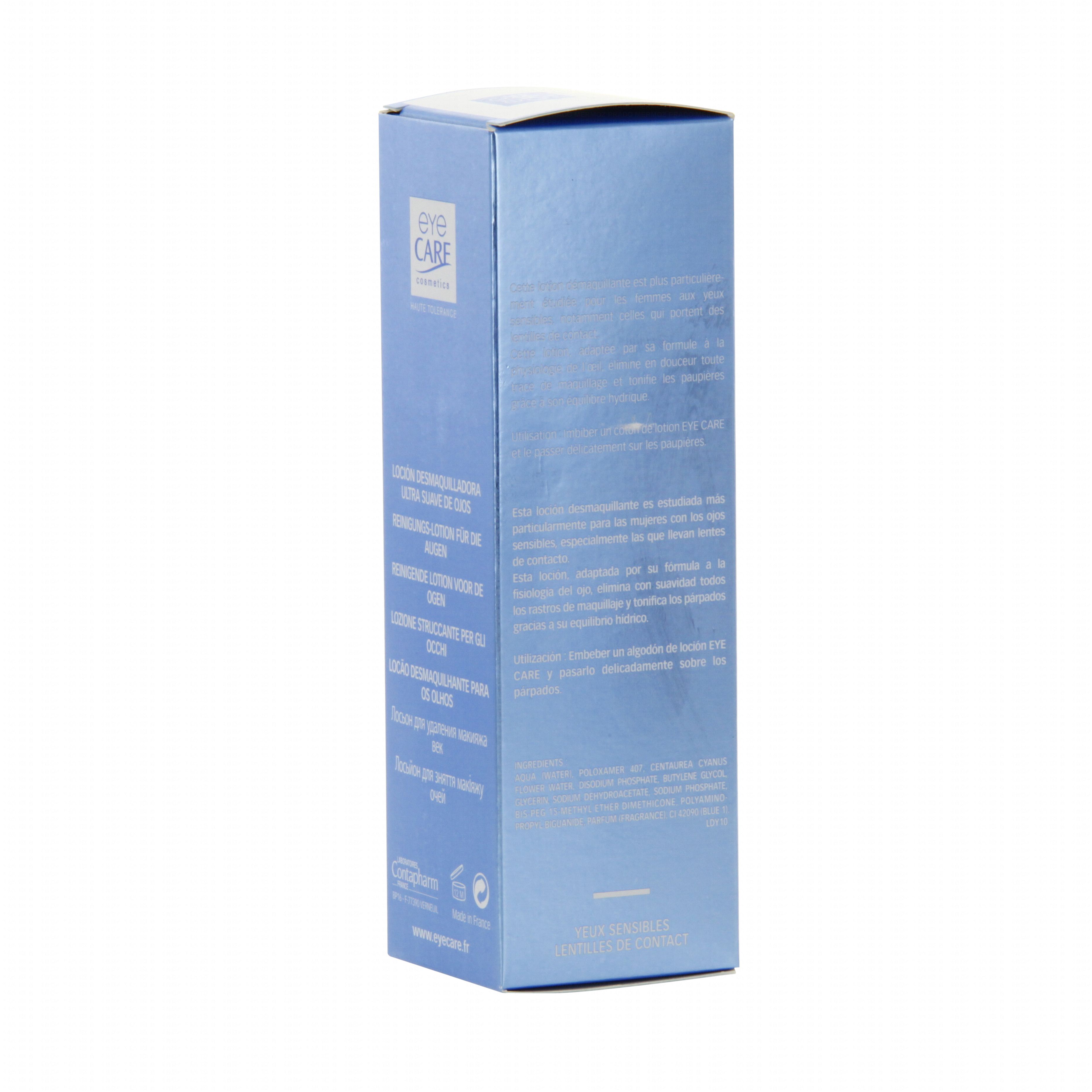 Formulée spécialement avec des tensio-actifs non ioniques, au pH des larmes et isotoniques aux larmes La Lotion Démaquillante Yeux Eye Care nettoie en douceur et apaise quotidiennement les yeux, même les plus sensibles. Elle est particulièrement recommandé aux porteuses de lentilles de contact. Elimine les traces de maquillage, tonifie les paupières. Isotonique aux larmes et pH lacrymal. Tolérance extrême, parfum sans allergène. Conditionnement : flacon, étui carton.