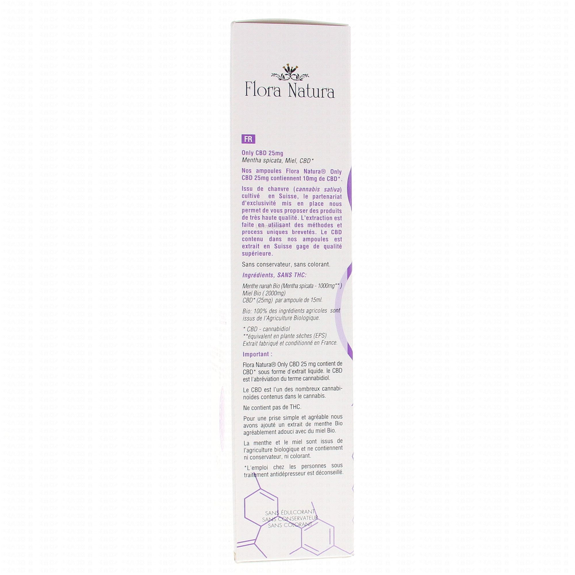 FLORA NATURA Only CBD 25mg boite de 20 ampoules contient 100% de CBD. Une ampoule contient 25mg de CBD.