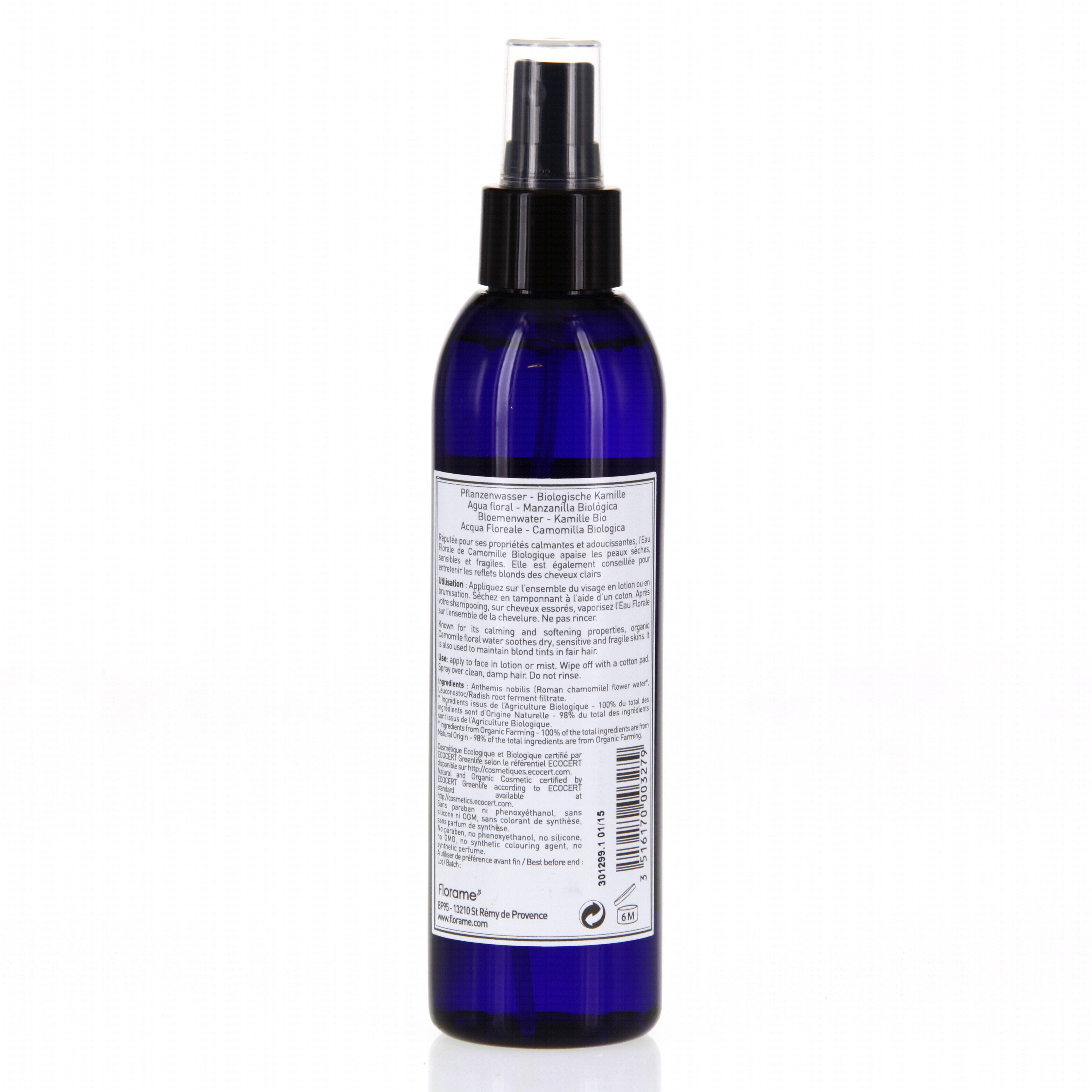 Anthemis Nobilis Flower Water*, Aqua (Water), Sodium Benzoate, Potassium Sorbate, Citric Acid. * ingrédients issus de l'Agriculture Biologique 99% du total des ingrédients sont d'Origine Naturelle 98% du total des ingrédients sont issus de l'Agriculture Biologique