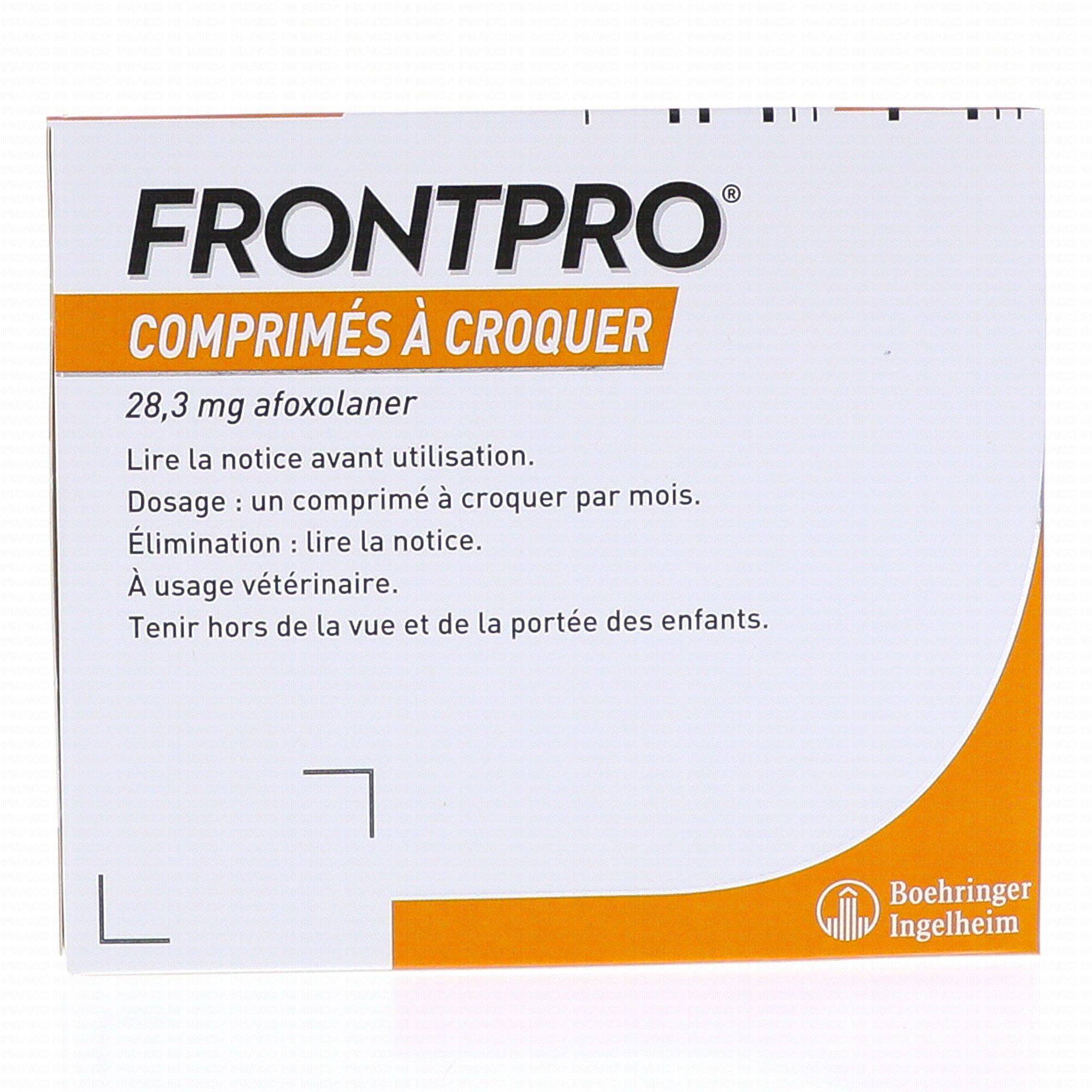 Frontpro Frontline est un comprimé antiparasitaire efficace contre les puces et tiques. Son principe actif est l'afoxolaner, un insecticide et acaricide. Frontpro tue les puces dans 8 heures et protège l'animal d'une réinfestation pendant 5 semaines. Par ailleurs, il tue les tiques dans les 48 heures et protège d'une réinfestation jusqu'à 1 mois. Cet antiparasitaire contribue également à protéger l'environnement de l'animal puisqu'il tue les puces avant la ponte des œufs et empêche ainsi la contamination de la maison.