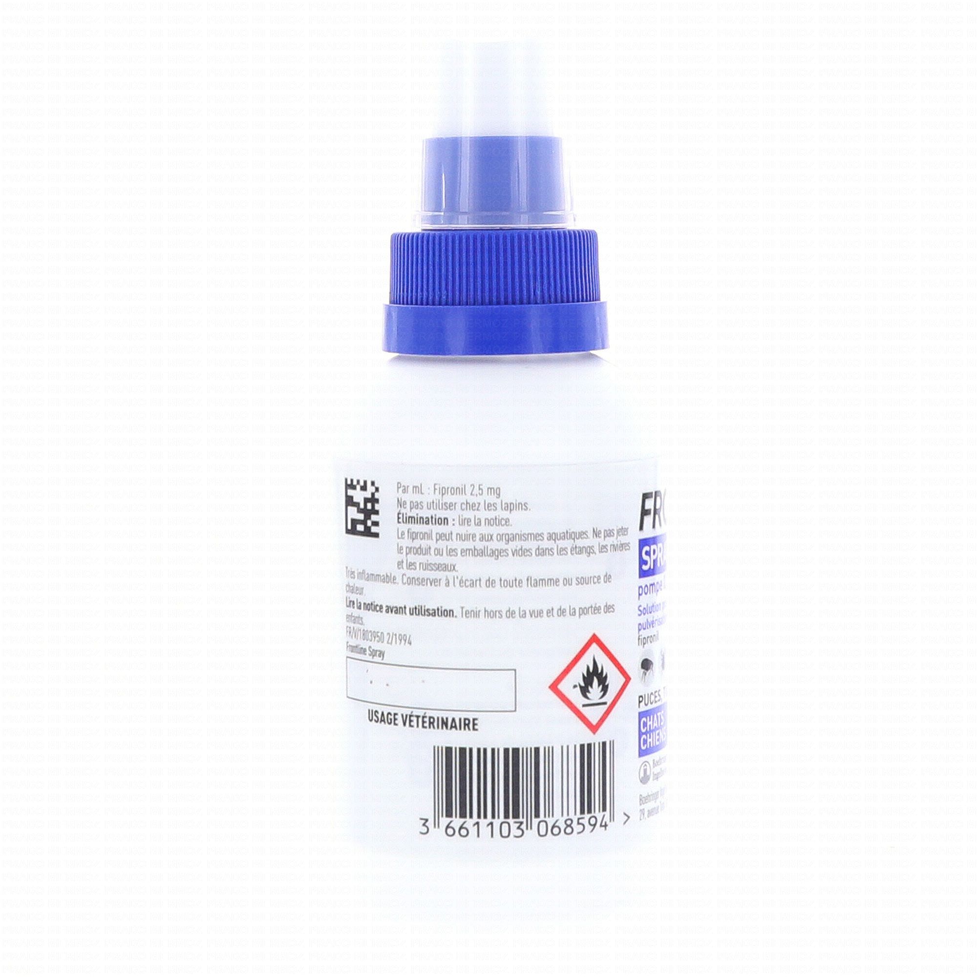 FRONTLINE spray agit en moins de 4 heures. C'est la solution idéale d'attaque lors d'infestation massive, pour traiter de très jeunes animaux (dès 2 jours) ou pour une solution économique pour traiter des animaux de poids différents. FRONTLINE Spray élimine les puces adultes et les tiques. Antipuce, antitique, antipoux. Durée d'efficacité chez le chien : contre les puces 60 à 90 jours, contre les tiques 30 jours environ. Durée d'efficacité chez le chat : contre les puces 40 jours environ, contre les tiques 2 semaines. Conditionnement : flacon pompe doseuse délivrant 0,5 ml par pulvérisation. Péremption : 2 ans. Usage vétérinaire.
