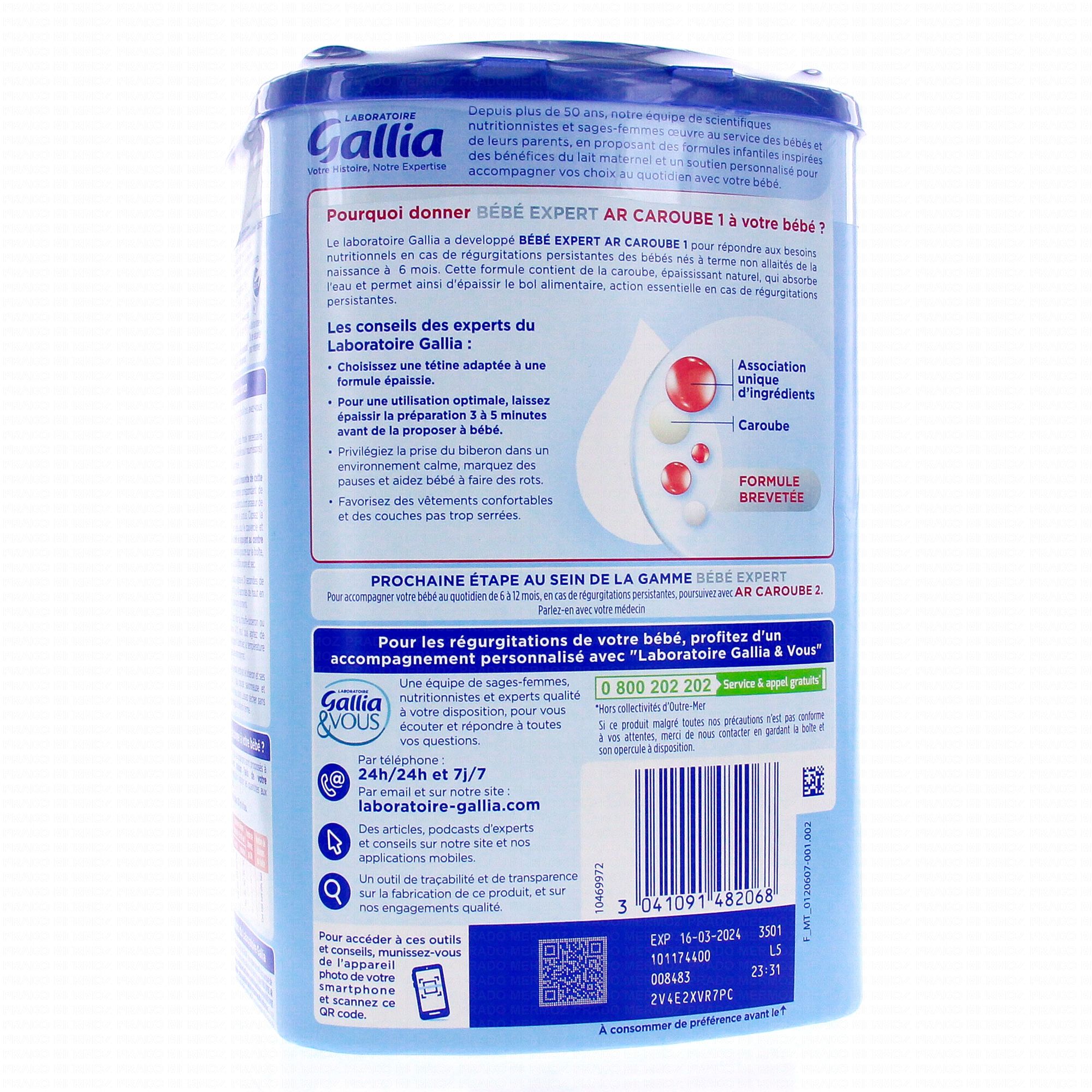 GALLIA Bébé expert Lait infantile AR 1er âge 800g contient les éléments suivants :